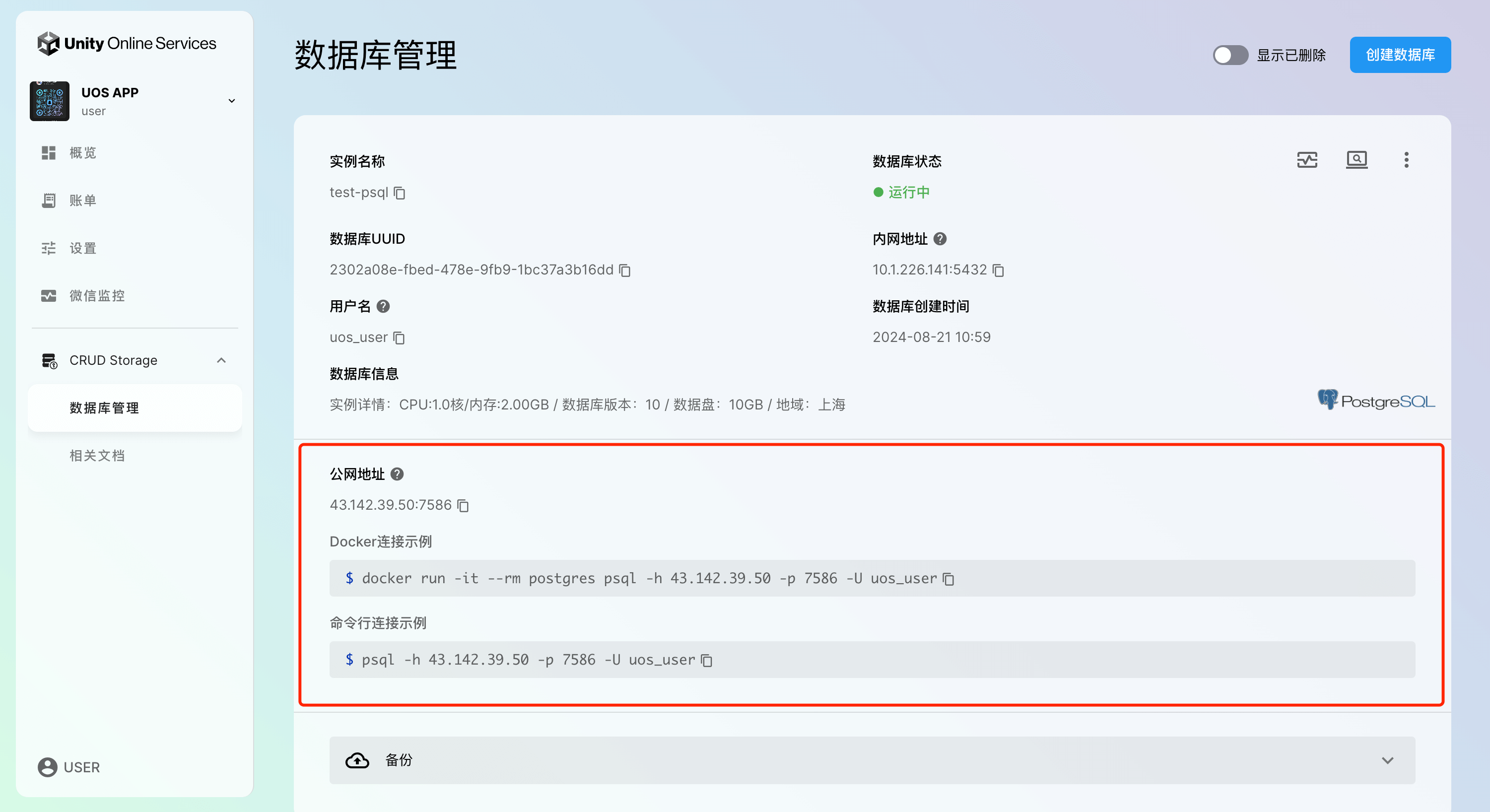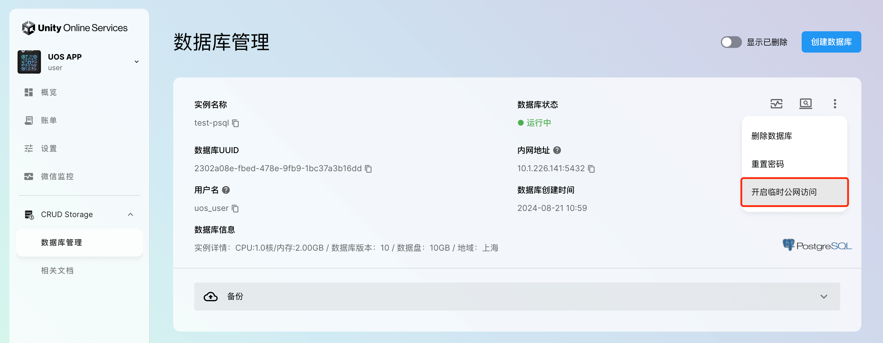 UOS Storage 默认不开放公网访问权限,如需临时从公网连接到该数据库 点击右上角选择「开启临时公网访问」,可以根据获取到的临时公网地址连接到该数据库,临时访问有效时限为1小时。