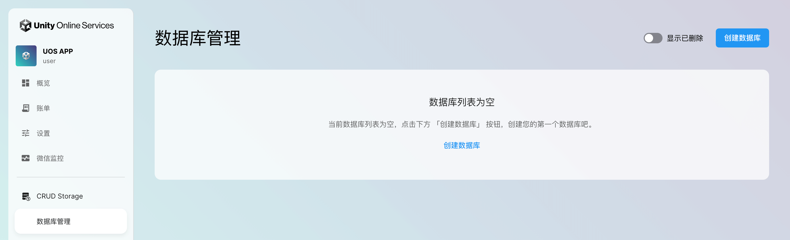 请确保您已经 创建 UOS APP 并开启 Storage 服务,进入 「CRUD Storage -> 数据库管理」 页面。