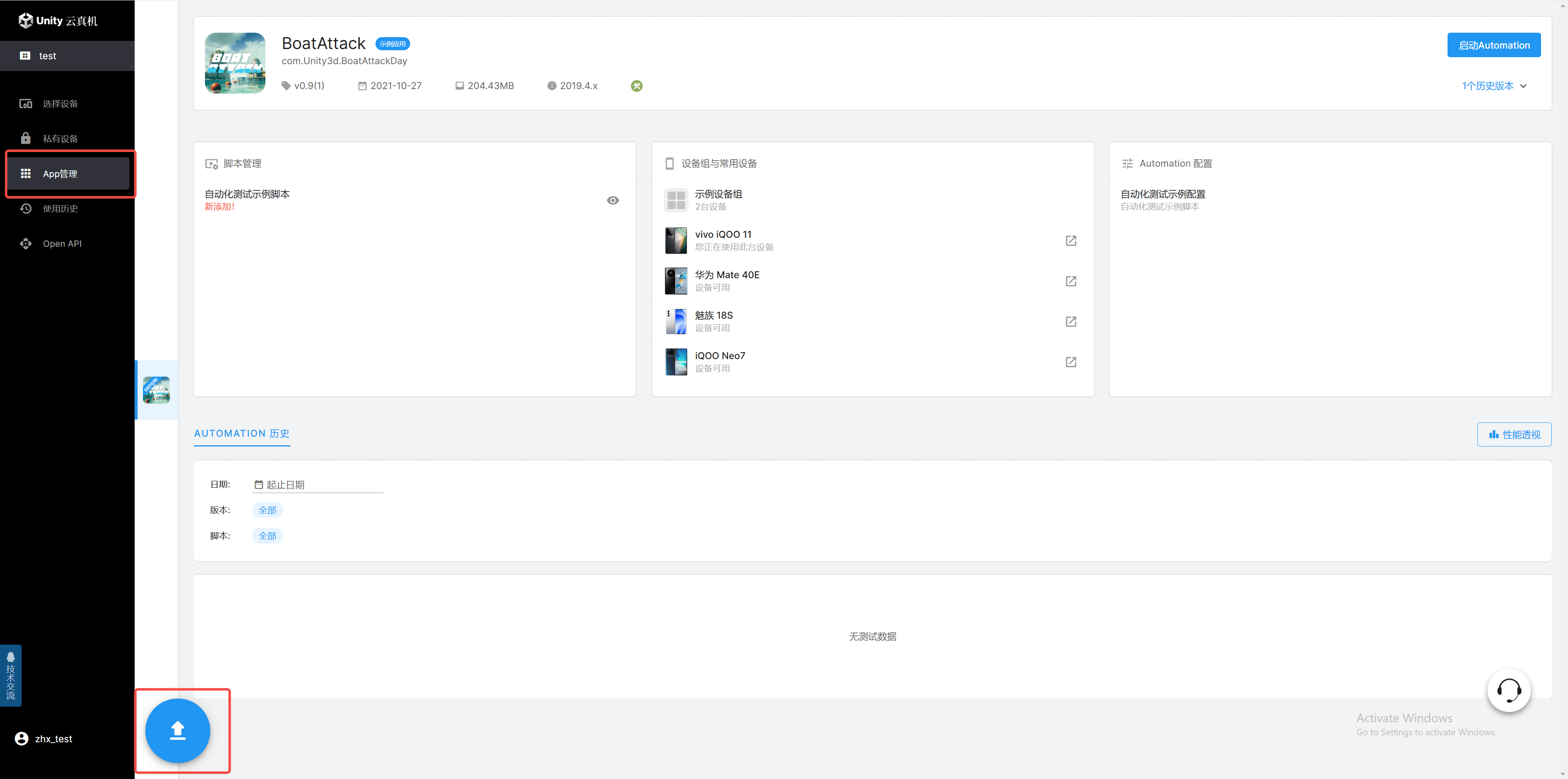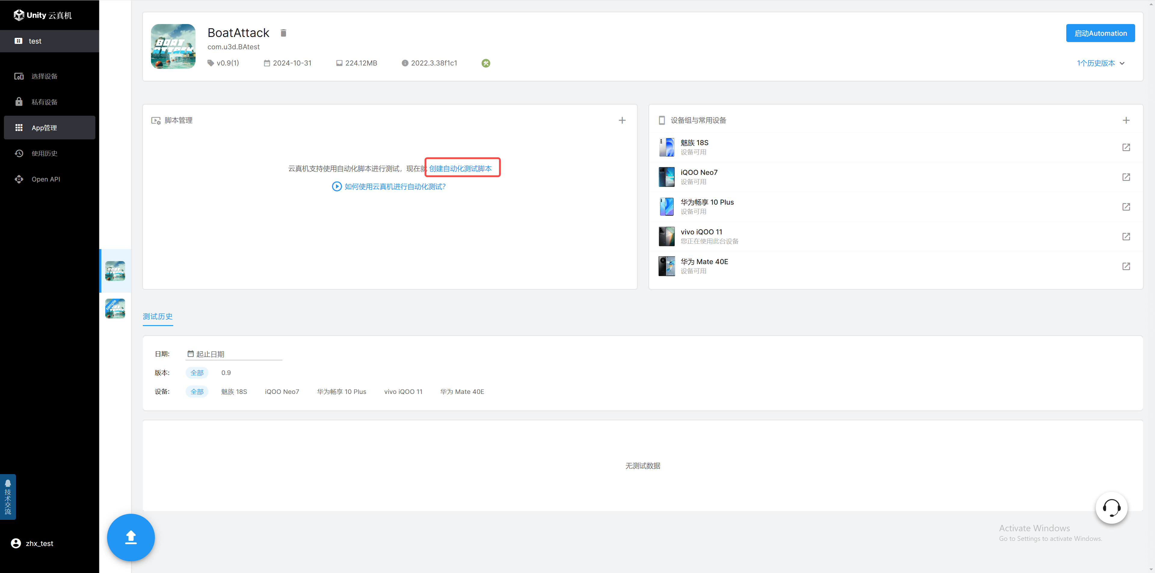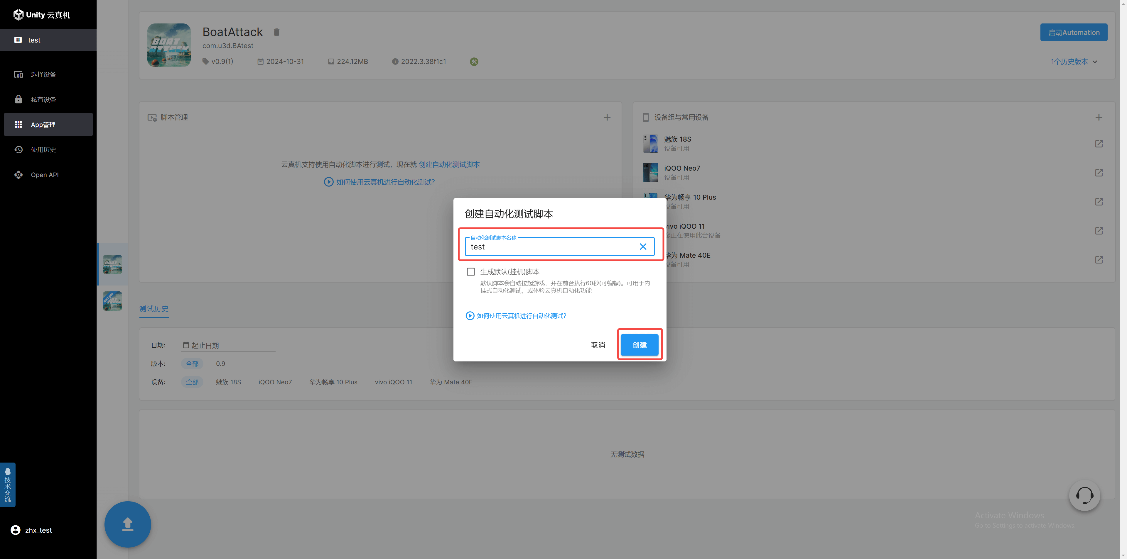 选择需要管理的app,点击 创建自动化测试脚本 。