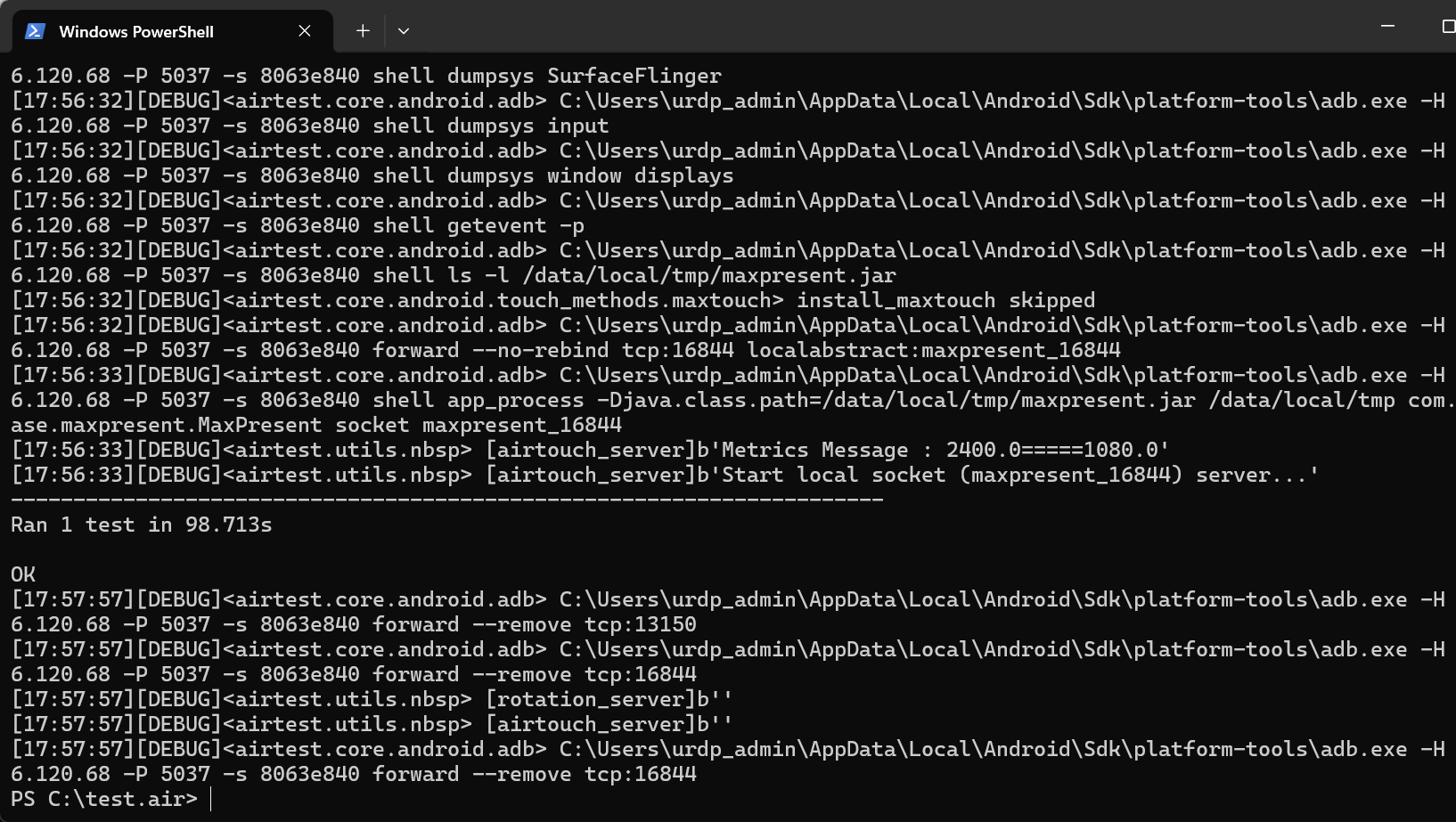 airtest run 测试脚本名 --device "Android://运行私有provider的电脑ip:5037/测试设备的序列号?cap_method=javacap"等待测试脚本执行结束。