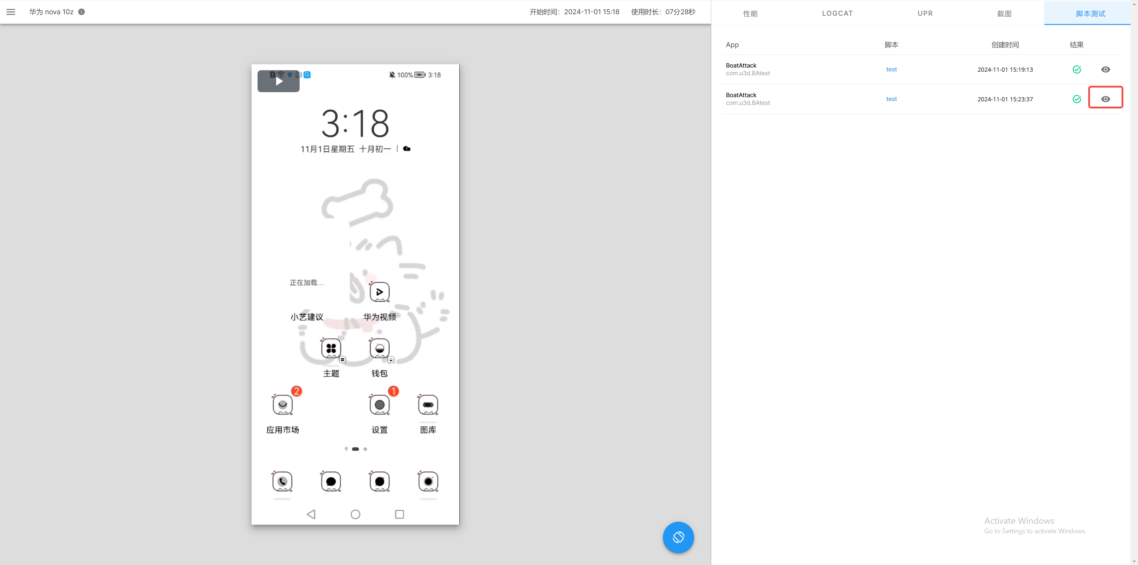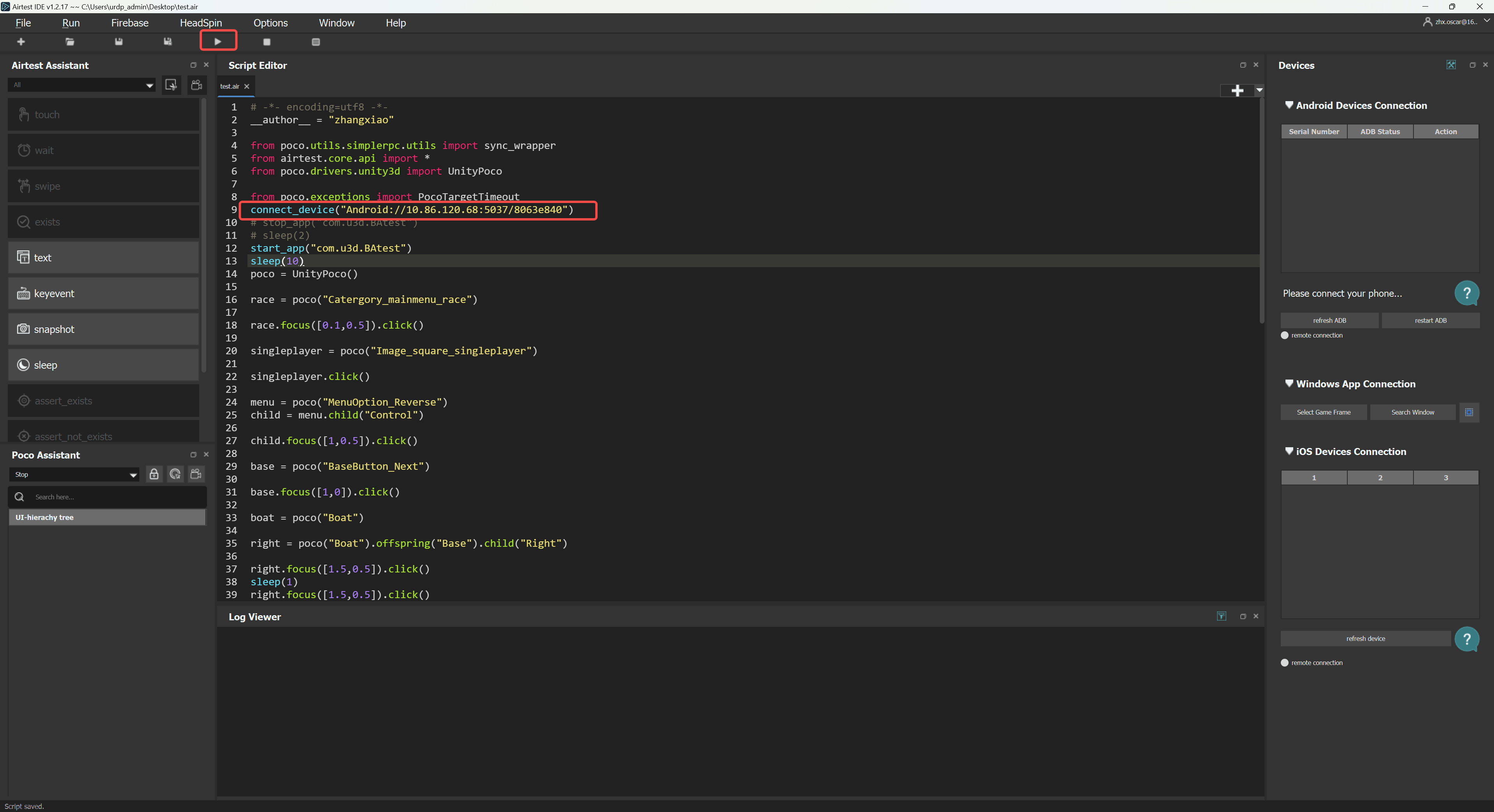 connect_device("Android://运行私有provider的电脑ip:5037/测试设备的序列号")点击运行脚本按钮即可开始测试。