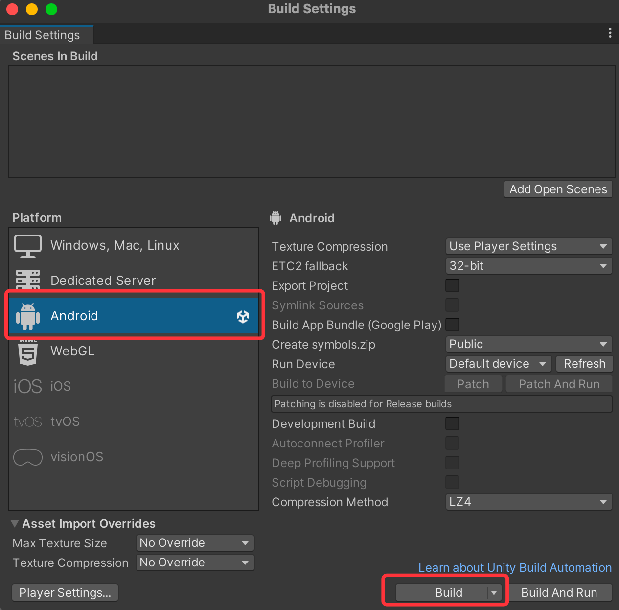 打开 「File->Build Settings」,Platform 选择 Android 平台,点击「Build」生成安卓apk,如果 UOS Stacktrace 面板中勾选了 Upload APK,SDK会在apk生成成功后自动将apk文件上传到UOS服务器。