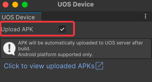 在 Unity Editor 菜单栏中打开 「UOS->Device->Open Panel」,可以通过勾选框 Upload APK 选择是否在生成安卓apk的同时上传相关的apk文件。