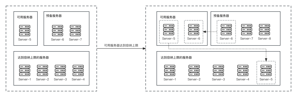 在正常运行情况下,Func Stateful会基于策略中的配置启用若干台服务器让其处于预备状态;当服务器达到策略中配置的容纳玩家上限时,Func Stateful会将预备服务器投入使用,并启用新的服务器来维持预备服务器的数目。