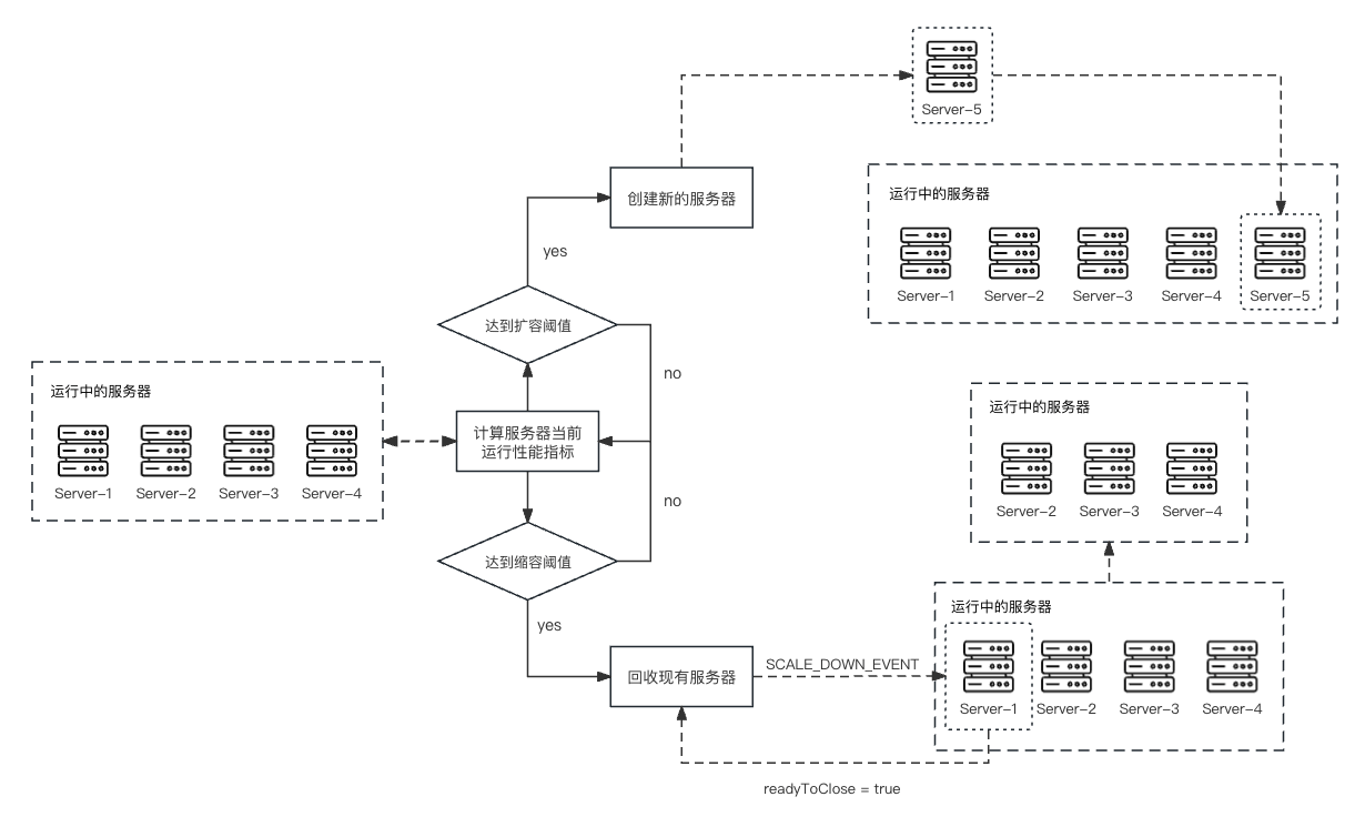 服务器的 缩容事件 和 扩容事件之间相互对应,分别应对计算资源冗余和计算资源紧缺的运行状况。启用服务器的弹性伸缩规则后,当计算资源冗余状况达到阈值时,Func Stateful 会对运行中的服务器的数目进行收缩,即触发缩容事件。缩容事件会对运行中的服务器进行回收和"数据清理"。因此,为了避免自动触发的 缩容事件 在回收服务器时造成资源或者数据的丢失,Func Stateful 会通过服务器心跳检测的返回值对 缩容事件(SCALE_DOWN_EVENT) 进行通知。