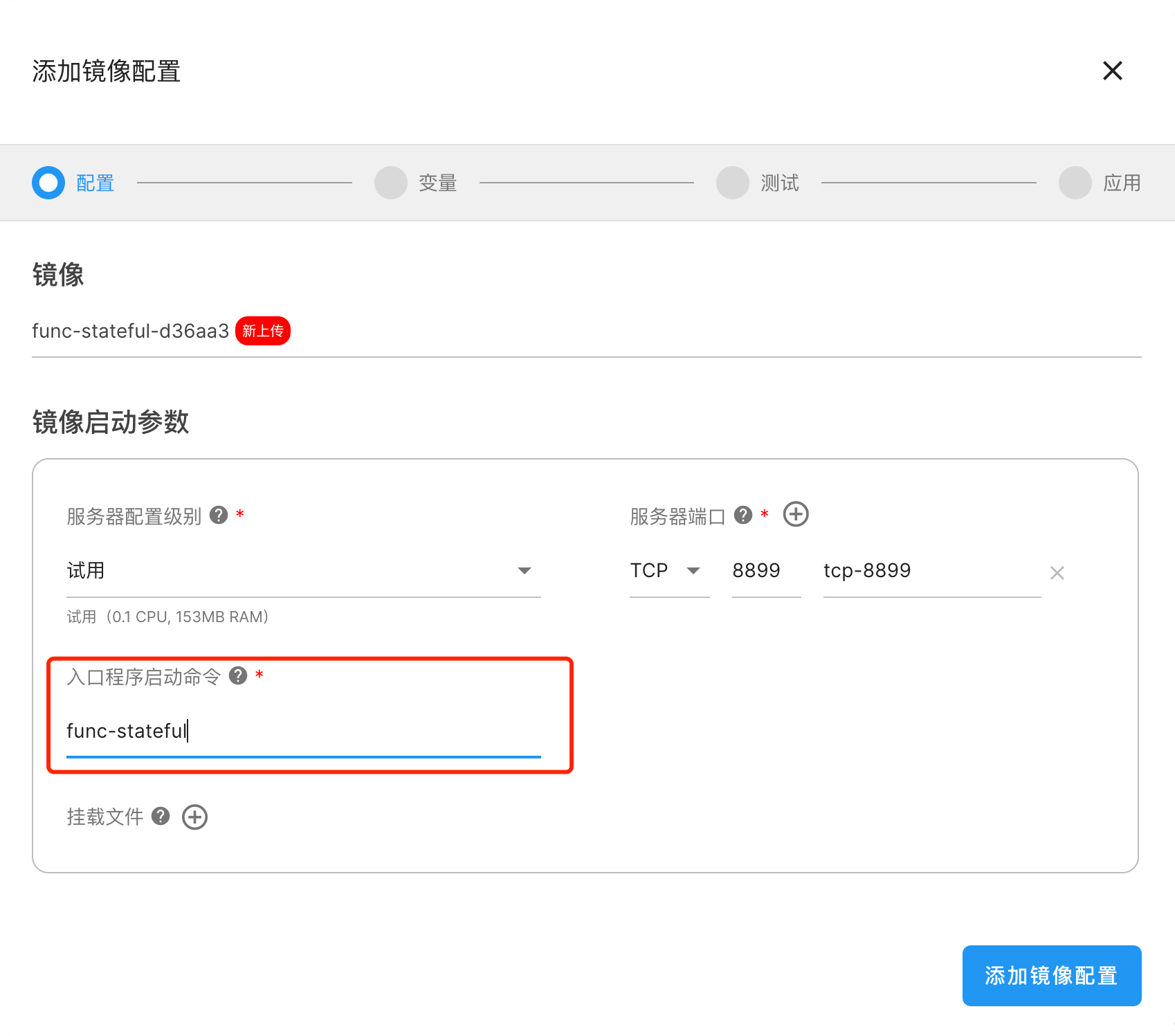 此外,在启动镜像配置时,也需要根据实际开发的项目修改「入口程序启动命令」(例如,“func-stateful",“java -jar SimpleHttpServer.jar",“node index.js",“python app.py")。
