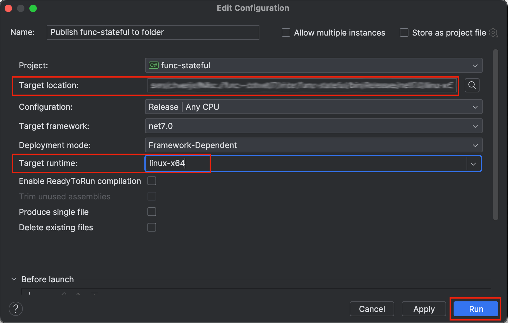 选择 Target Location 目标目录到任意指定位置, Target Runtime 目标运行时选择 linux-x64 ,随后点击 Run 运行。