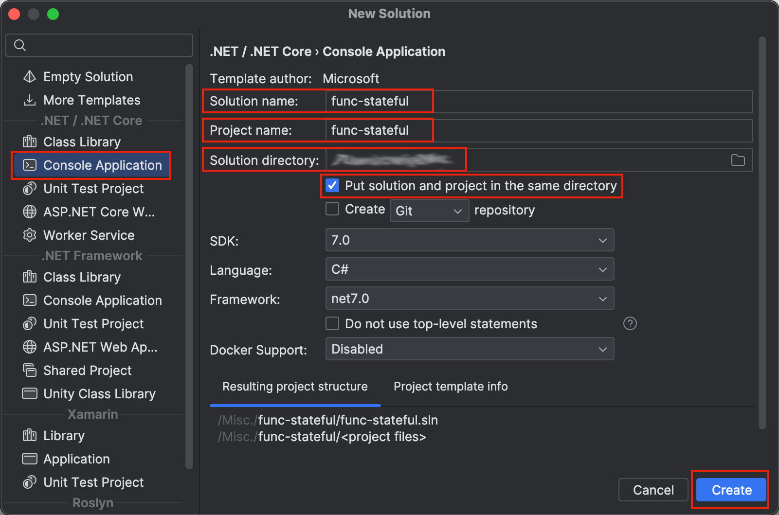 在左侧选择 Console Application, 随后填写 Solution Name 和 Project Name 为 func-stateful, 选择 Solution directory 到任意指定位置, 勾选上 Put solution and project in the same directory。 同时根据系统所安装的 SDK 版本进行选择, 然后点击 Create 完成创建。