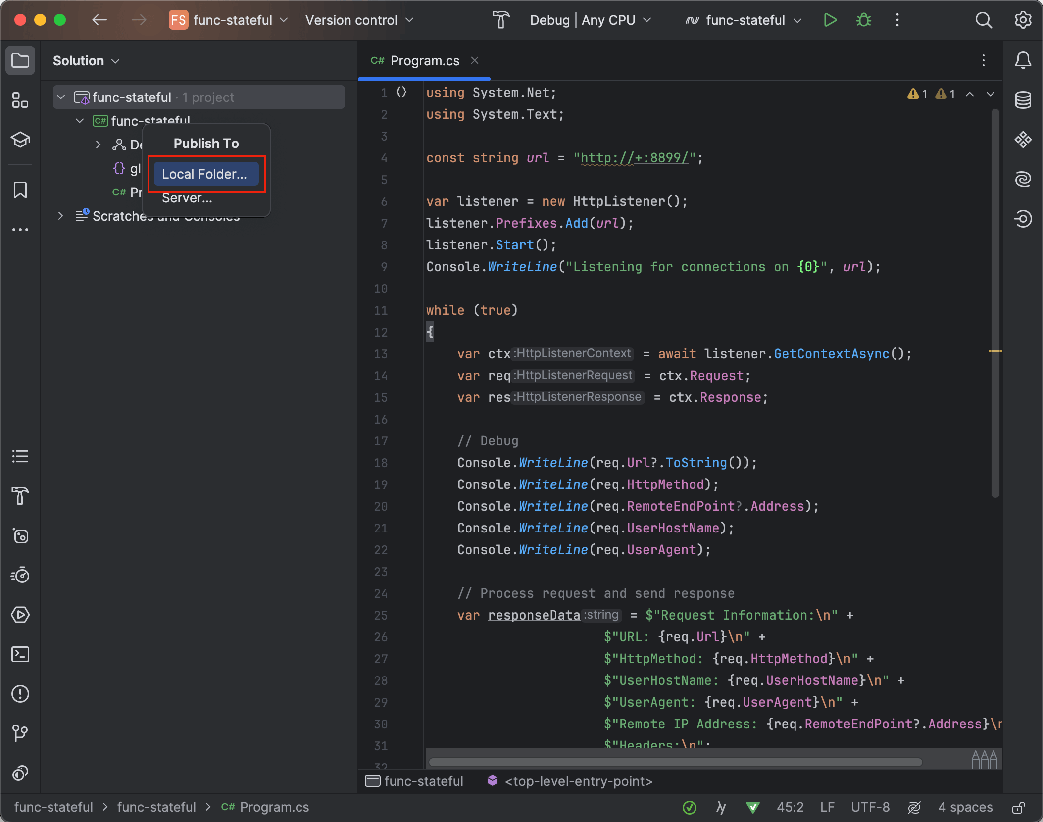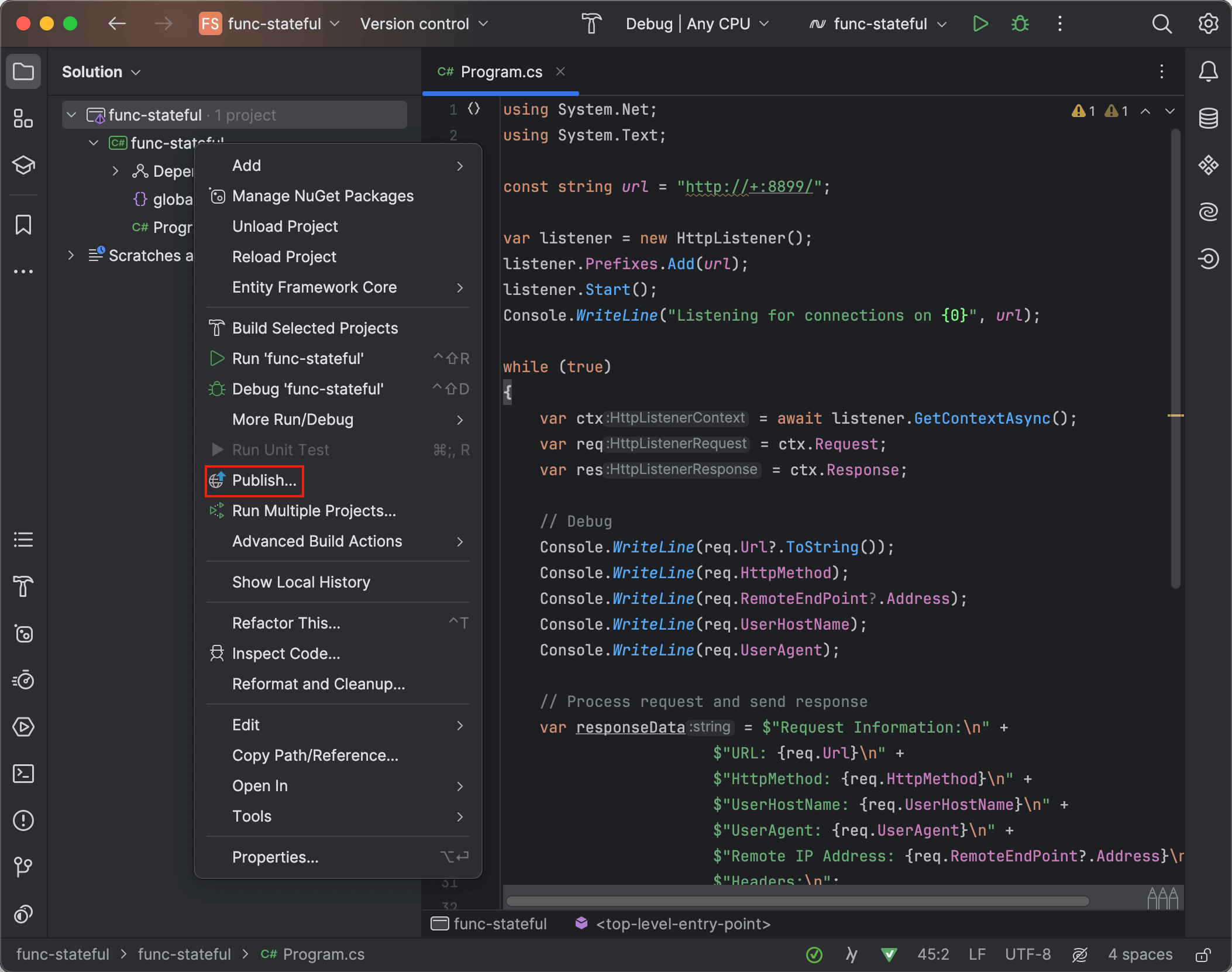 随后右键点击左边的 func-stateful 项目后在菜单中选择 publish 选项。