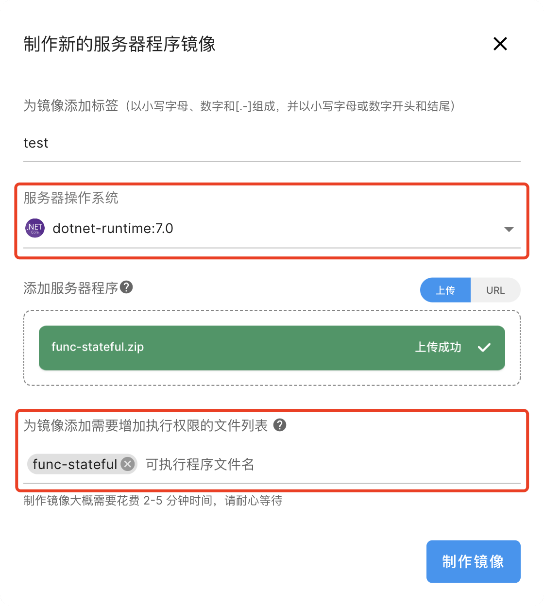 需要注意的是,在上传和制作镜像的过程中,需要根据开发过程中所使用的编程语言以及对应版本选择相应的服务器操作系统,并按照需要填写需要执行文件名添加权限。