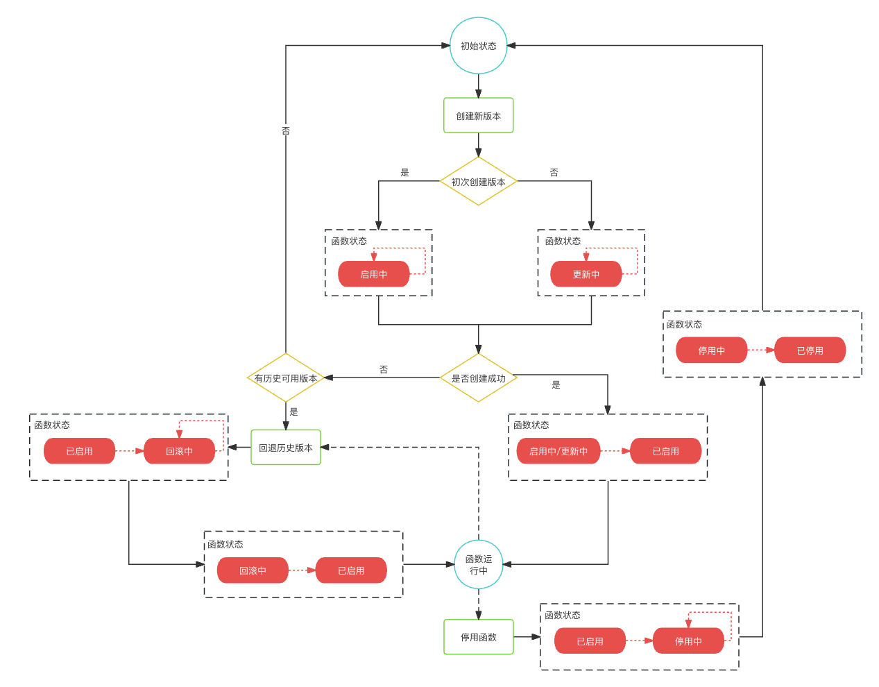 在 Func Stateless 的函数页面进行"创建新版本","停用函数","回退历史版本"等操作后,随着应用状态的变化,所涉及的相应版本中的函数状态也会进行变更:
