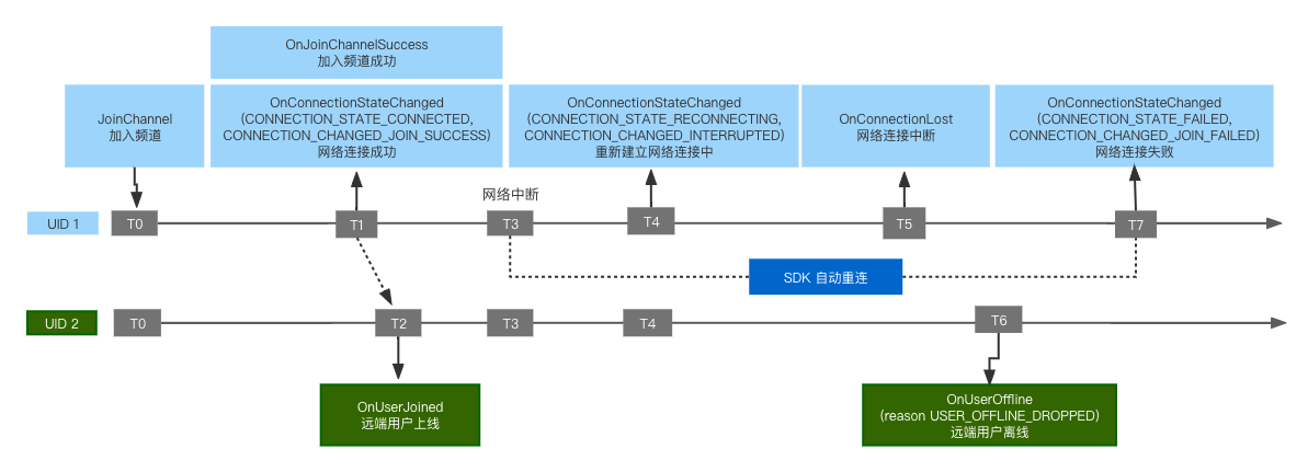 - T7:如果 UID 1 收到 OnConnectionStateChanged(RECONNCTING, INTERRUPTED) 后连续 20 分钟无法重新加入频道,SDK 不再继续尝试。UID 1 收到 OnConnectionStateChanged(FAILED, JOIN_FAILED) 回调;用户需要退出当前频道,然后重新加入频道。