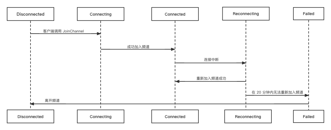 | Failed | 连接失败。 发生在 SDK 在 20 分钟内无法加入频道、并且 SDK 停止重新连接频道时。 此时需调用 LeaveChannel 离开当前频道,再调用 JoinChannel 再次加入频道。 |