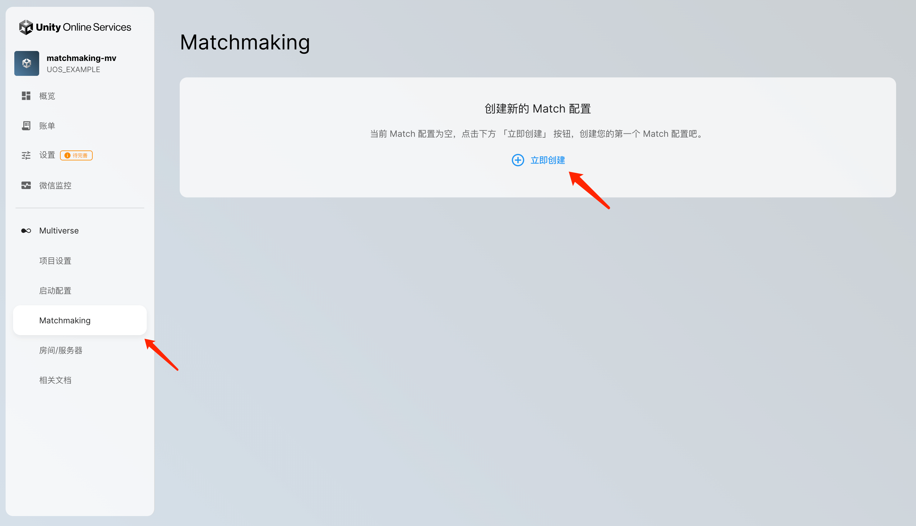 启用「Matchmaking」功能后,可以通过目录进入「Matchmaking」的页面,点击「立即创建」按钮就可以开始创建 Match 配置。