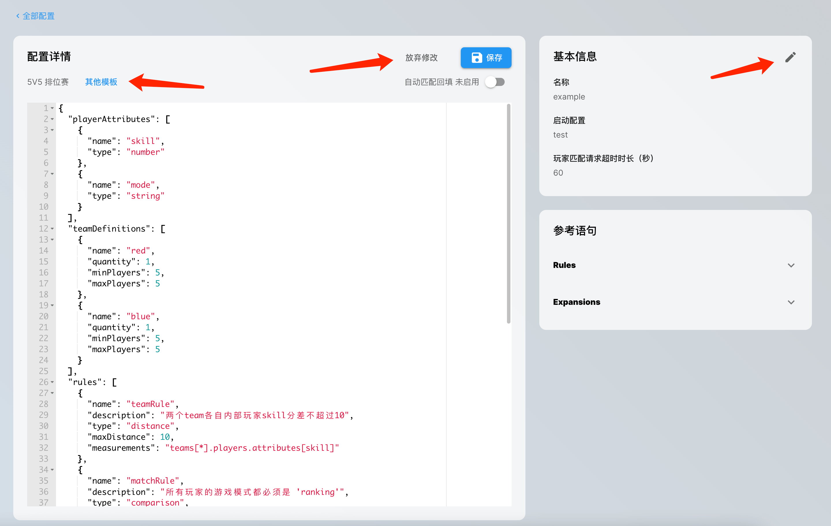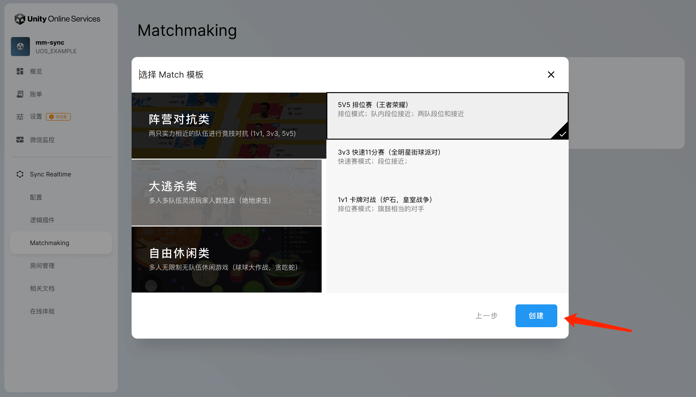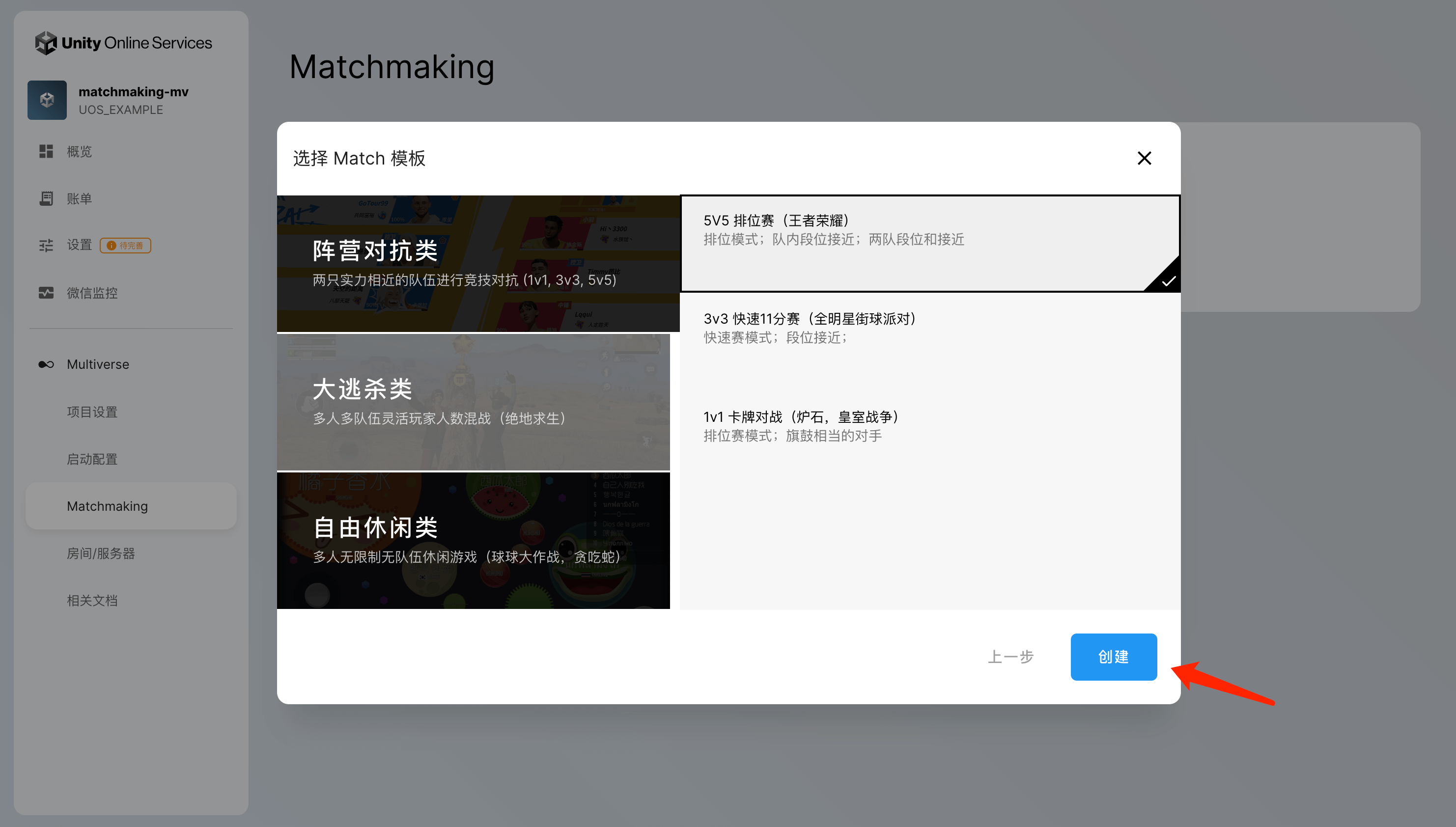 我们基于市面上常见的游戏玩法及其匹配机制为用户事先准备了一系列的 Match 配置的模板。在本教程中,我们以「5v5排位赛」的玩法匹配模板为例进行说明。选择了相应的模板后,点击「创建」之后,就可以创建相应的 Match 配置。