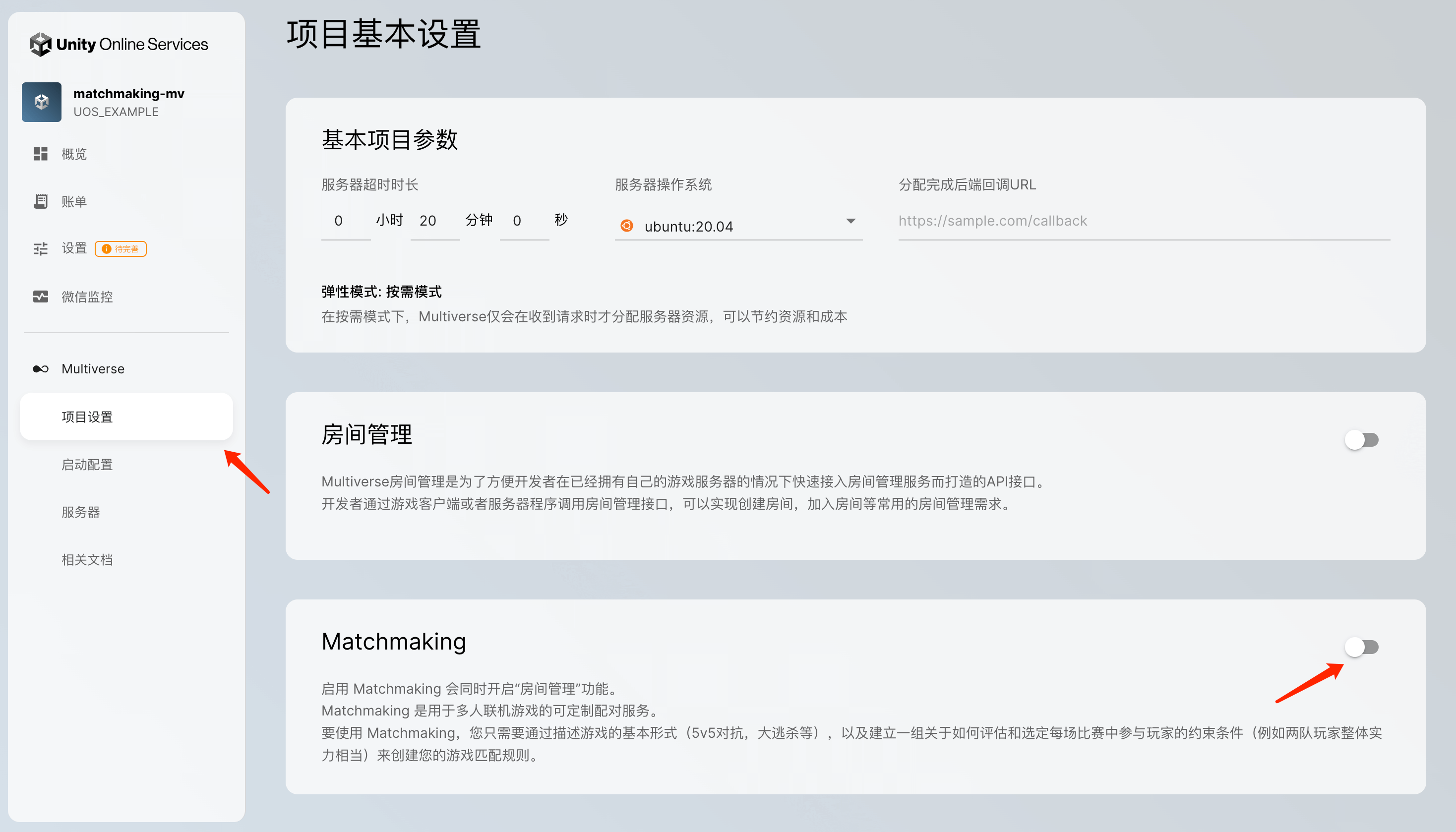请确保您已经 创建 UOS APP 并开启 Multiverse 服务,进入「项目设置」页面,点击启用「Matchmaking」功能,并进行确认。