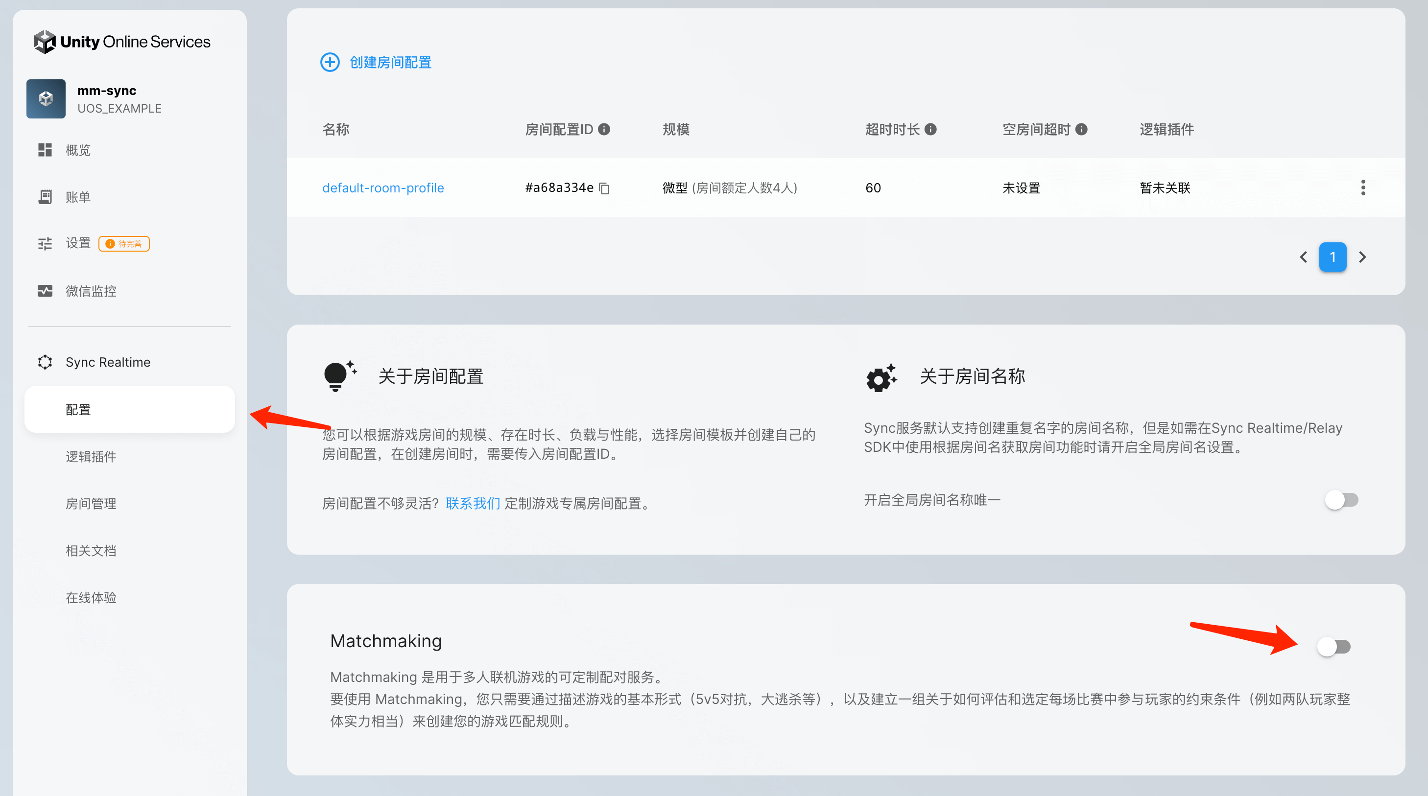需要注意的是,Matchmaking作为Multiverse的支持"玩家匹配"的功能,依赖于Multiverse的「房间管理」功能。因此,对于没有启用「房间管理」功能的应用,在启用「Matchmaking」后,会自动启动「房间管理」功能。