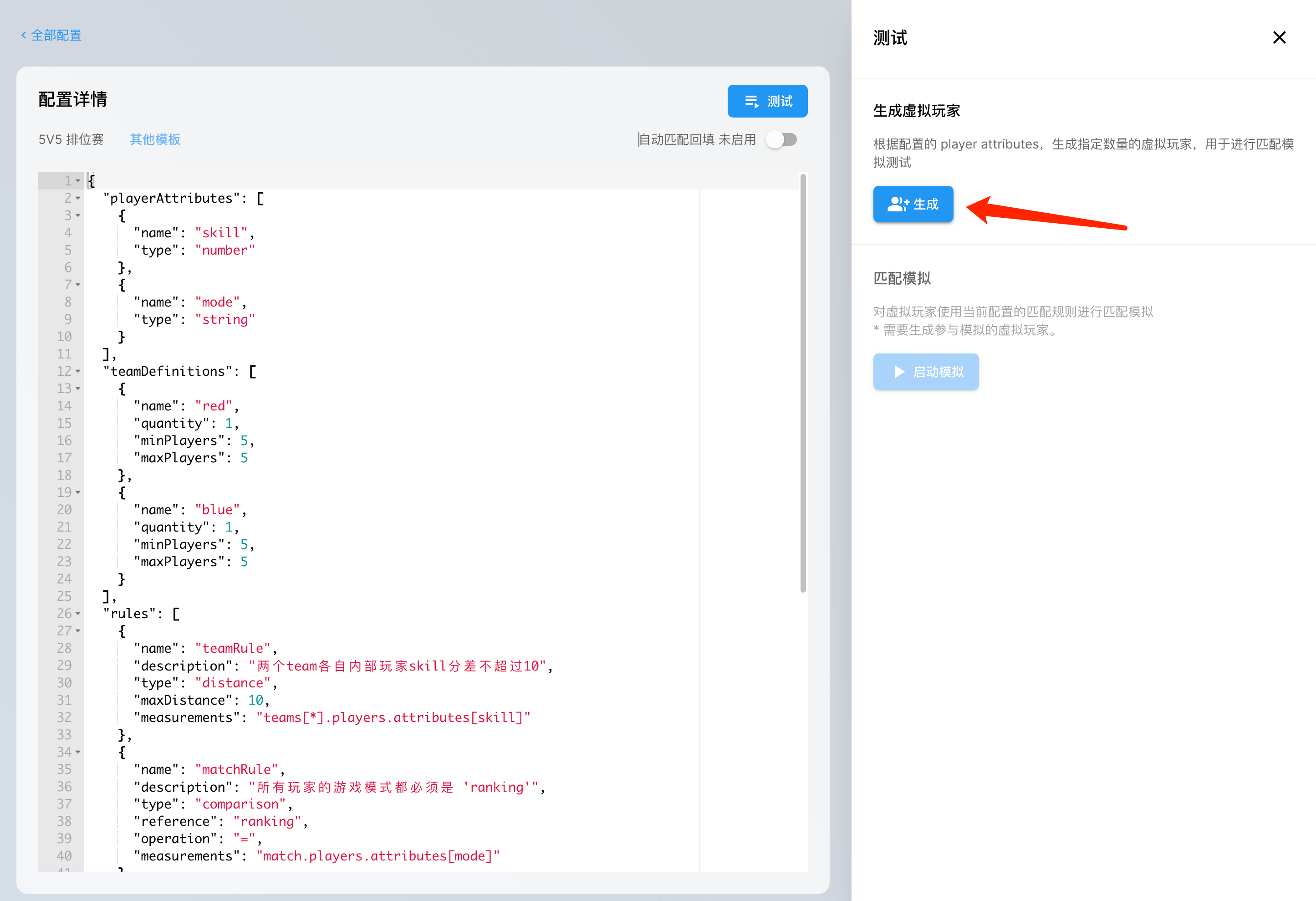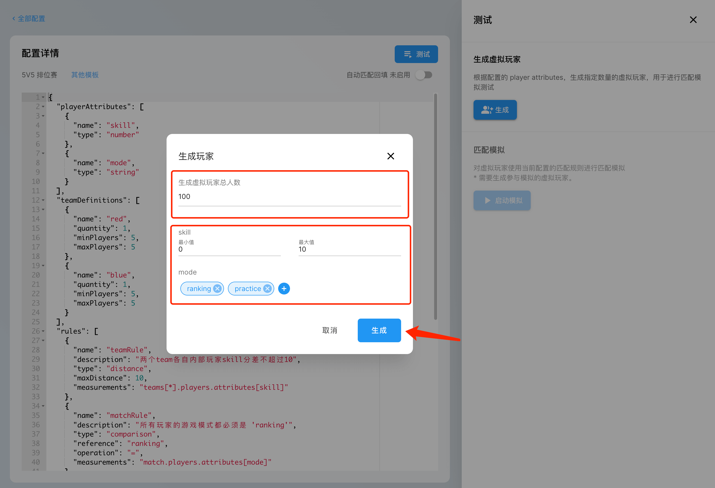 在生成模拟用户的窗口中,我们需要设置生成的模拟用户的数量,并且根据模板中提供的玩家属性,来设置随机生成的用户的各项属性值。