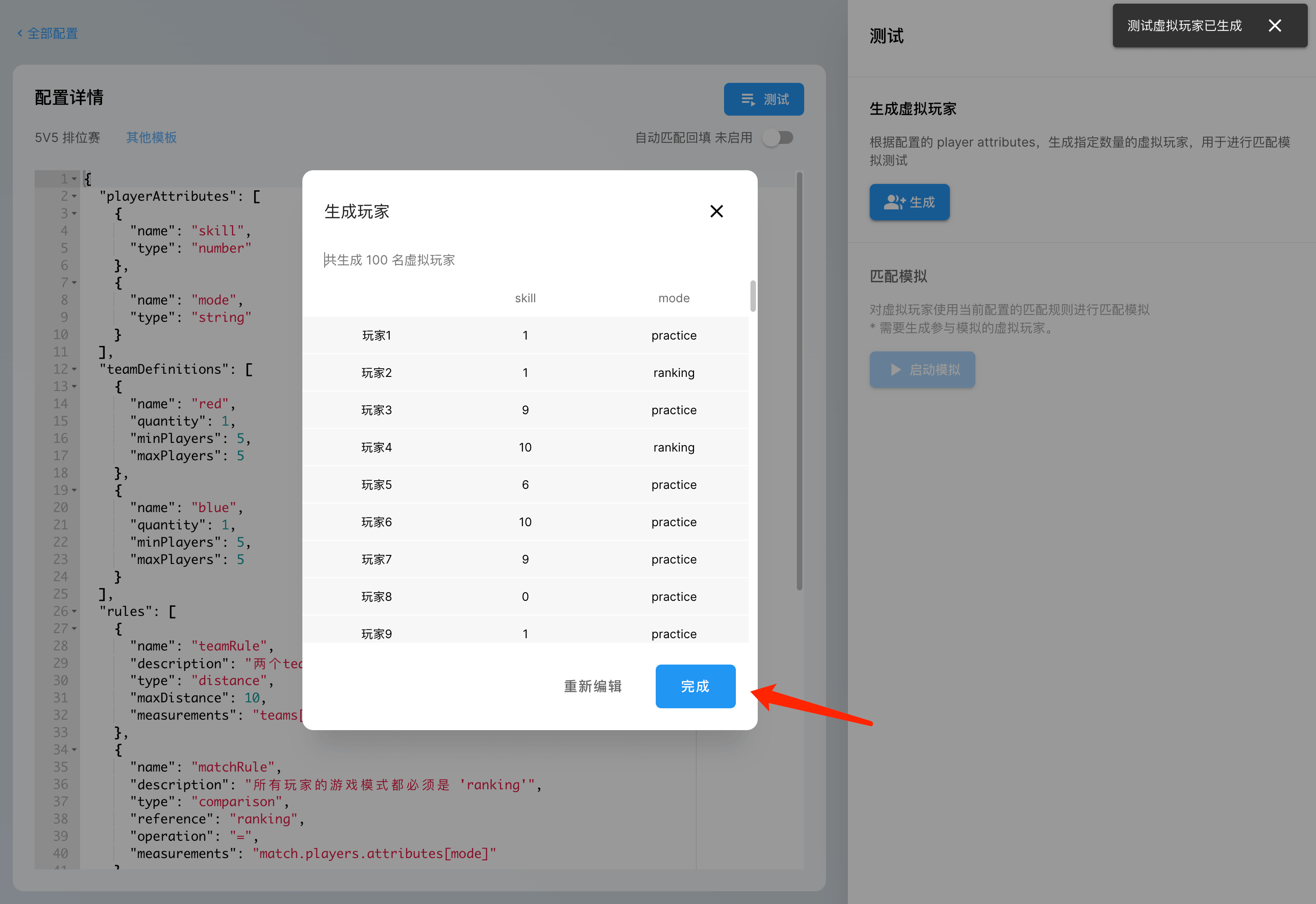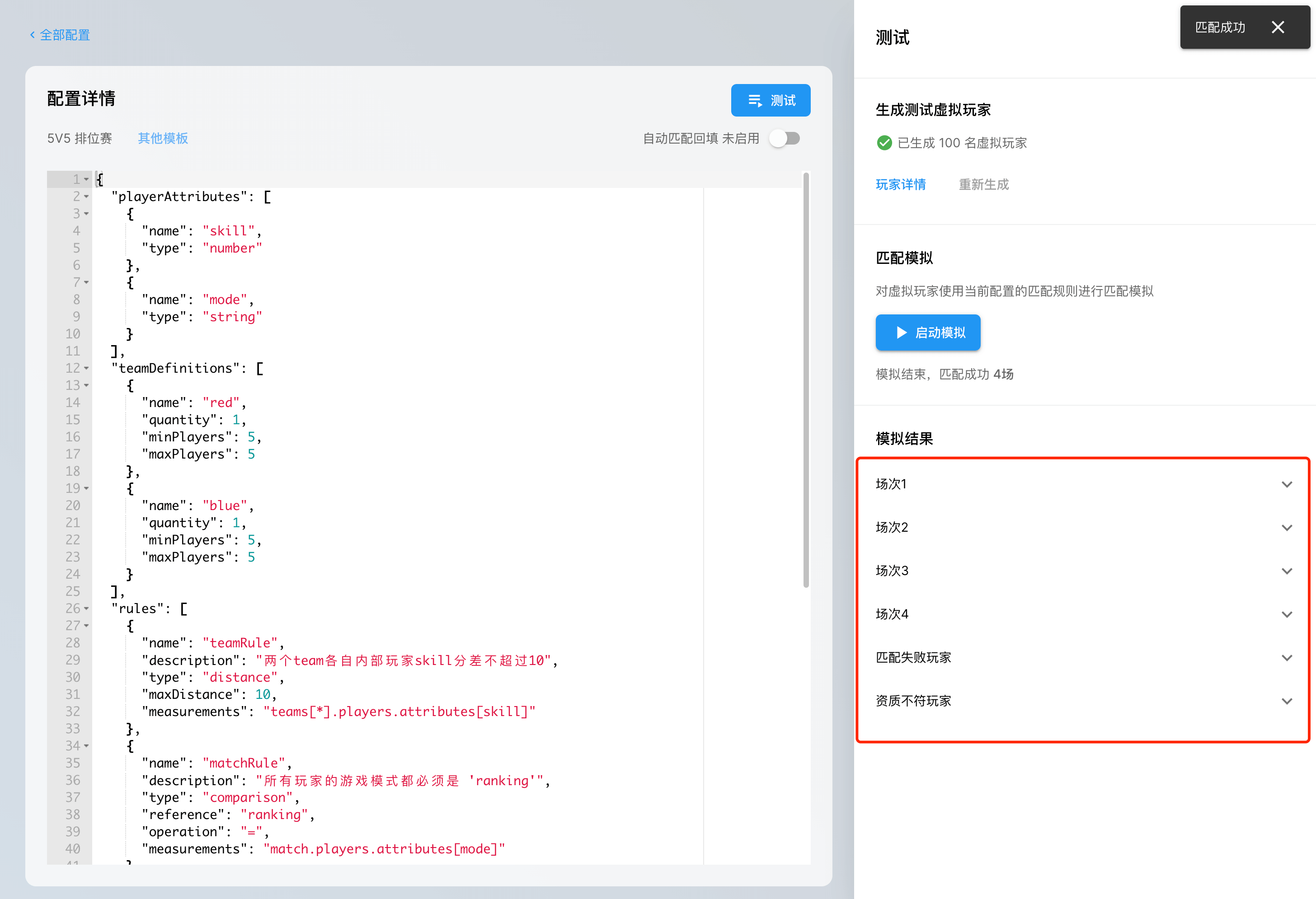 点击「启动模拟」,进行匹配的模拟。匹配模拟的结果会展示在页面的下方。因为在随机生成的用户的过程中,我们将用户的游戏模式(mode)的范围设置在了排位(ranking)和练习(practice)两类,而我们选择的模板只针对于「5v5排位赛」,所以会有一部分用户进入「资质不符玩家」的列表中,而其余用户则会划分至不同的场次,人数不足以开启对局的玩家,则会进入「匹配失败玩家」的列表中。