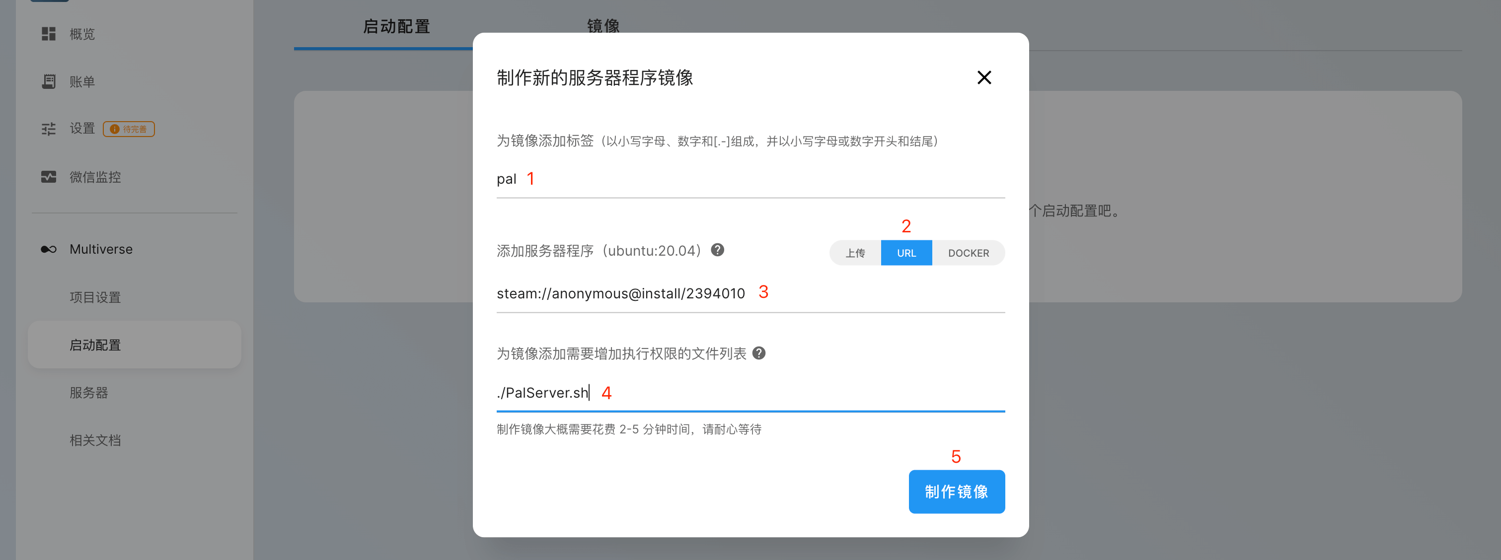 填写镜像标签信息(以pal为例), 服务器程序来源选择「URL」,填入url地址 steam://anonymous@install/2394010, 执行权限的文件列表处填入 ./PalServer.sh,点击「制作镜像」等待镜像制作完成并「创建启动配置」。
