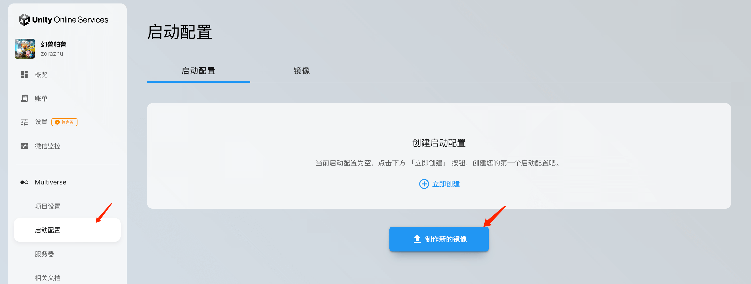 点击 Multiverse 侧边栏进入「启动配置」页面,当前并无镜像与启动配置,点击「制作新的镜像」: