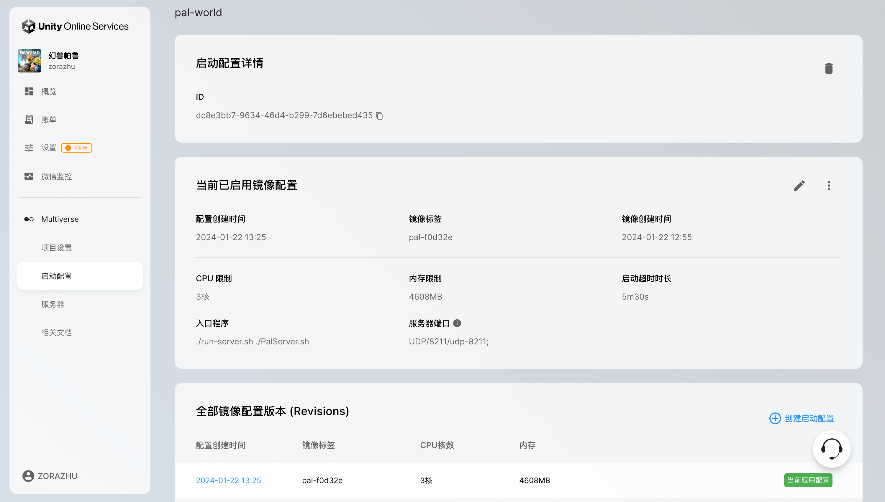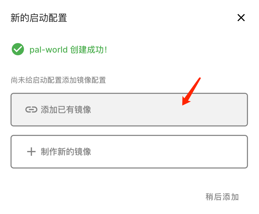 创建启动配置,填写配置名称,示例为 pal-world ,也可自定义,点击「创建」后可看到 "pal-world 创建成功!"提示。