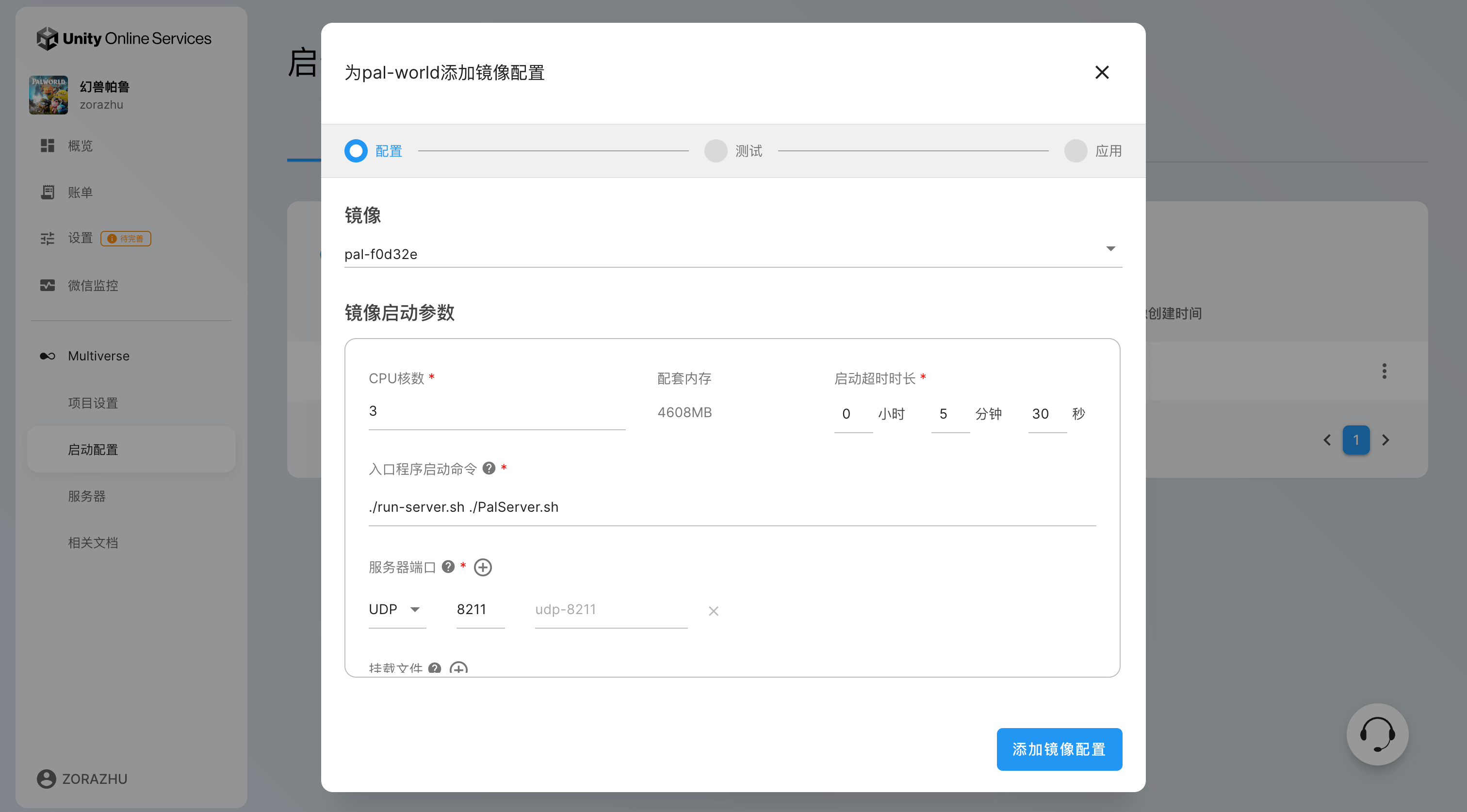 填写镜像配置信息,镜像已默认选中,对于 PalWorld 的游戏服务器,推荐至少 4608MB 的内存限制(即,CPU核数为2),启动时长建议 5分30秒, 入口程序填入 ./run-server.sh ./PalServer.sh,端口为协议 UDP,端口号 8211,填写完毕点击「添加镜像配置」: