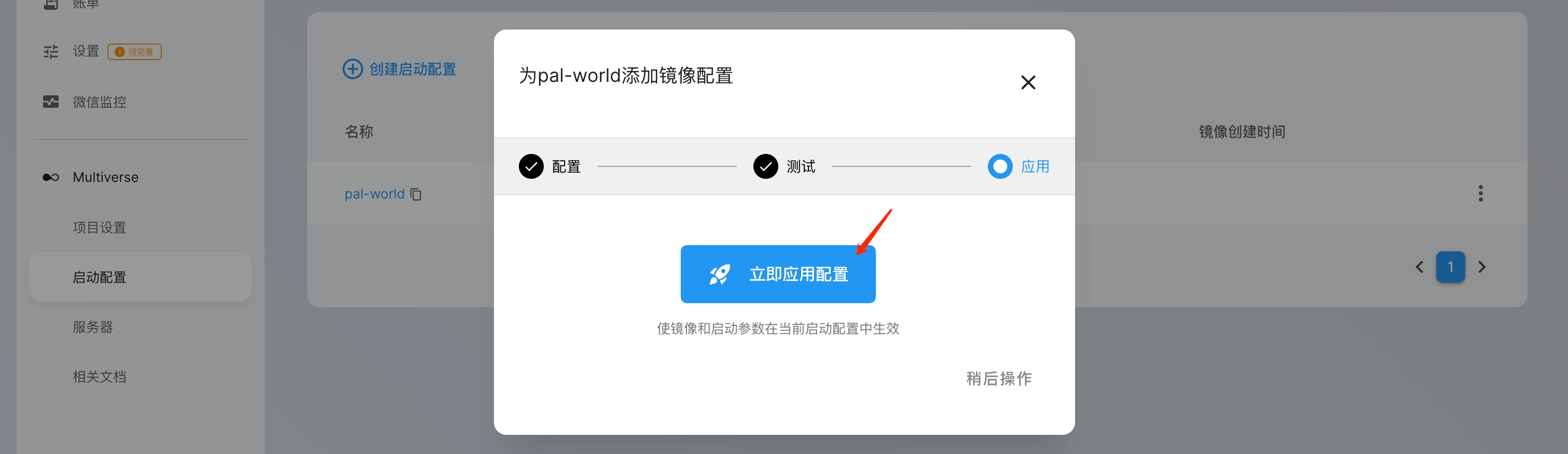 镜像配置添加成功后,建议「立即测试镜像」以确保程序在刚刚的配置下可以正常运行。测试成功后可「下一步」并点击「应用镜像配置」进入 pal-world 的详情页面。
