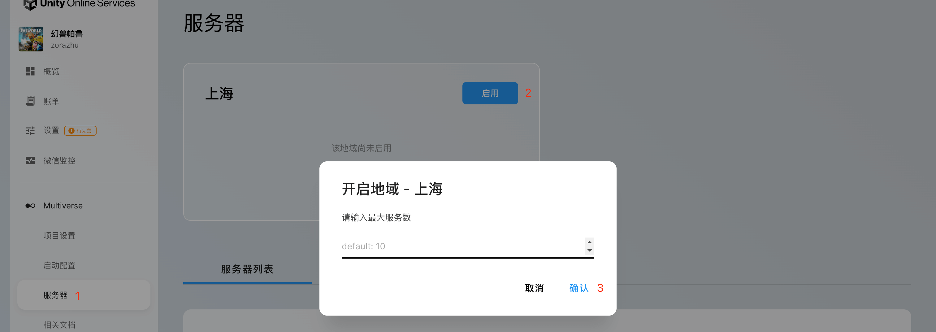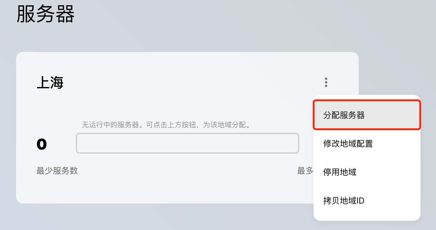 可以看到,此时尚未启用任何地域,也未分配服务器,点击「启用」并填写最大服务数,可直接点击「确认」以默认值10为最大服务数完成开启。