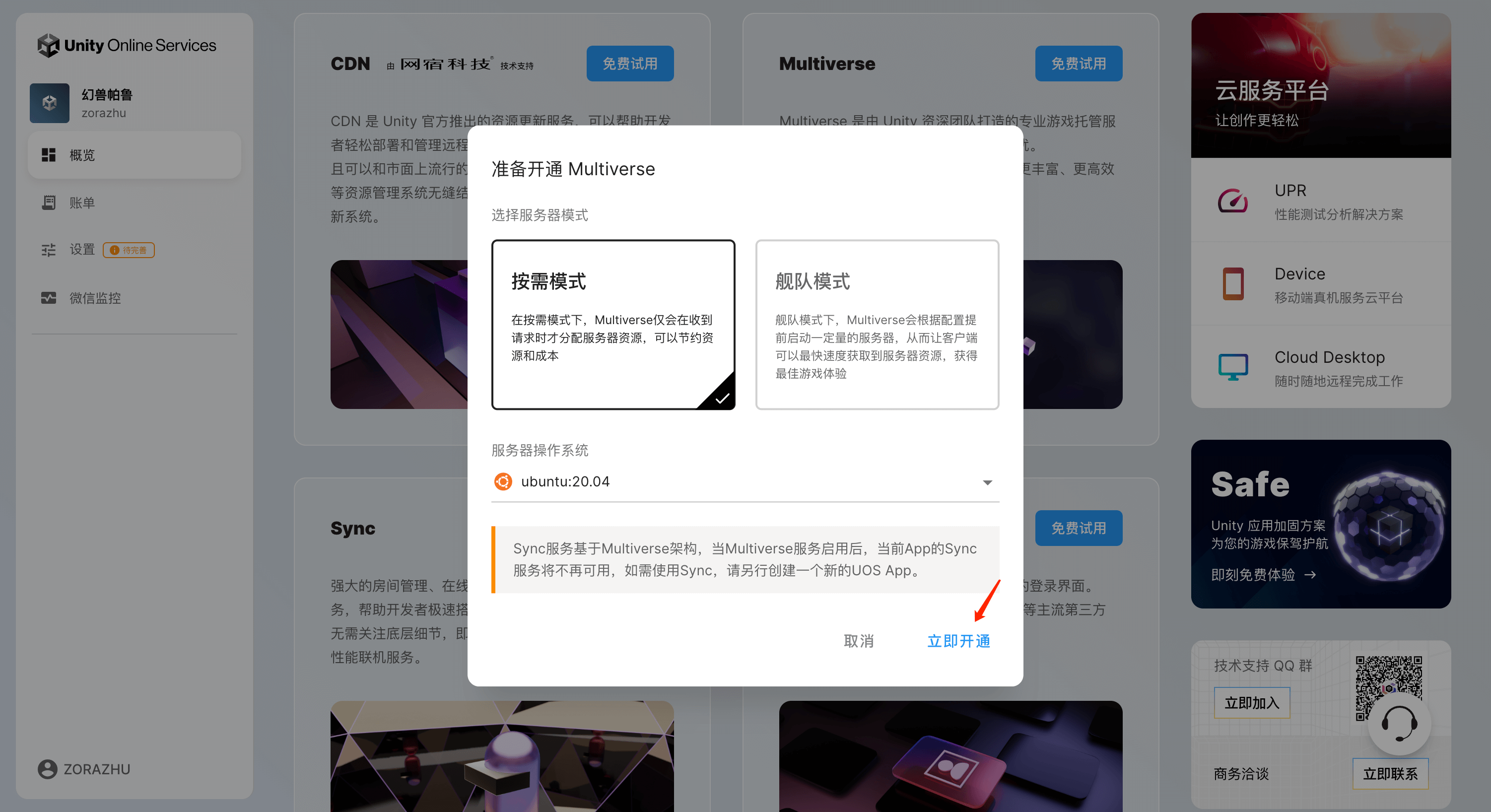 完成 创建 UOS APP 后,在项目的控制面板,点击 Multiverse「免费试用」,默认选择“按需模式”,点击「立即开通」进入Multiverse 项目设置页面: