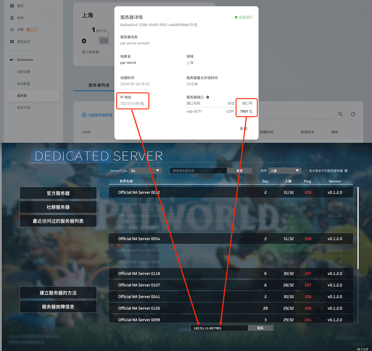 点击服务器UUID值查看服务器详情,获取到服务器的IP与端口(使用Multiverse映射后的端口),将IP地址和端口号复制粘贴到游戏下方输入栏: