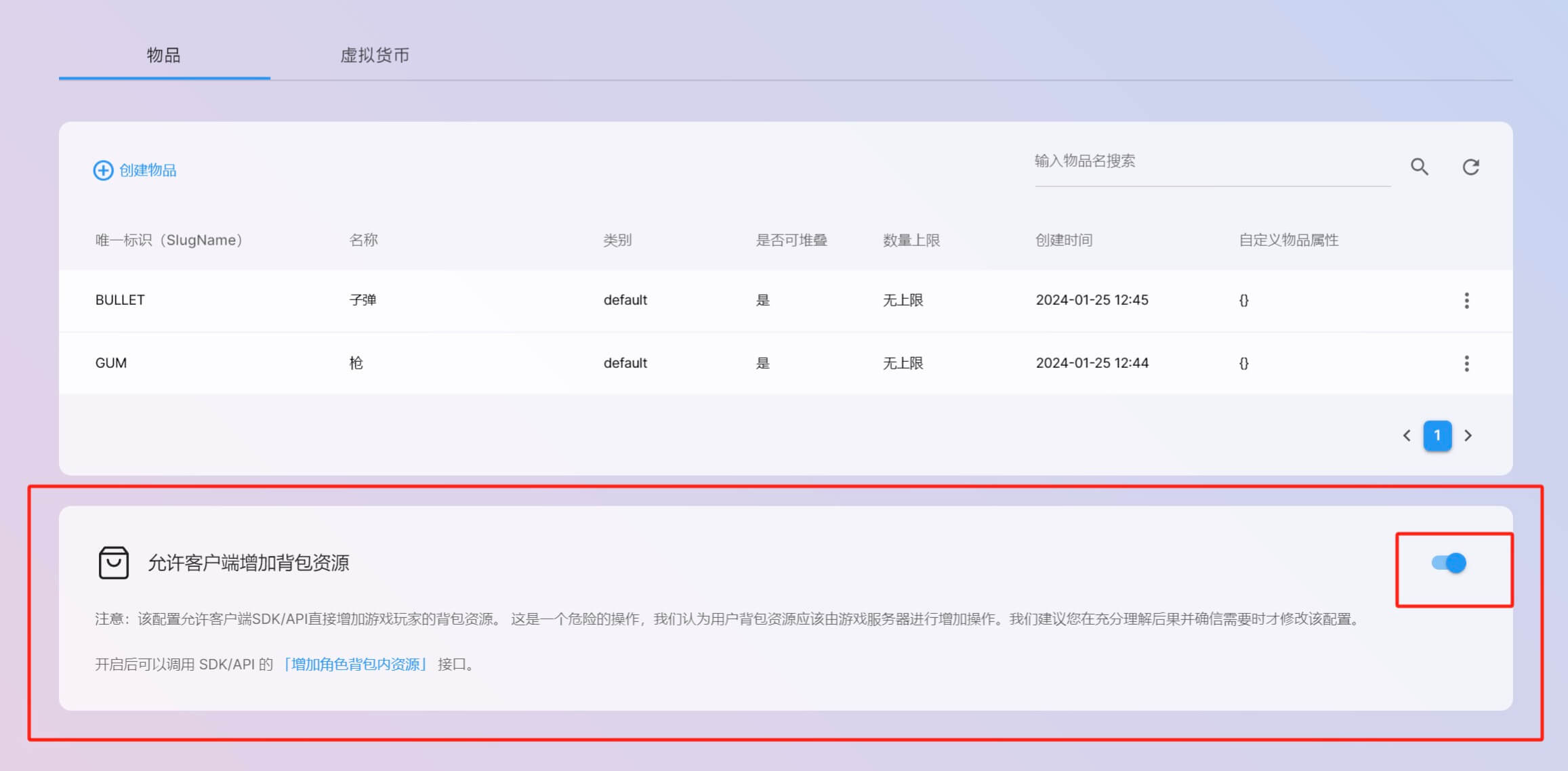 - 虚拟货币可堆叠:虚拟货币在角色背包内是否可堆叠,默认值为true,代表虚拟货币在放入背包的时候按slug合并