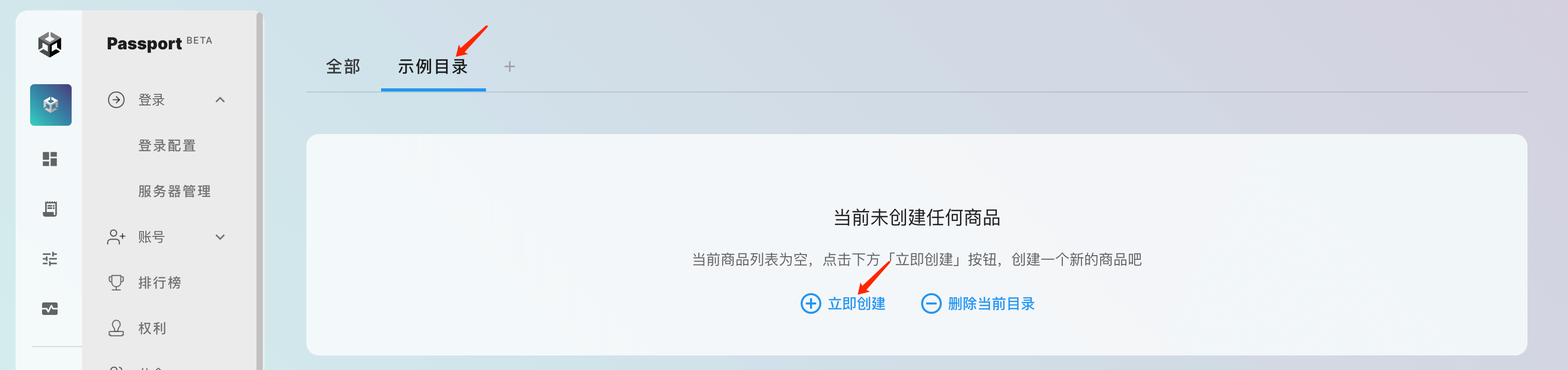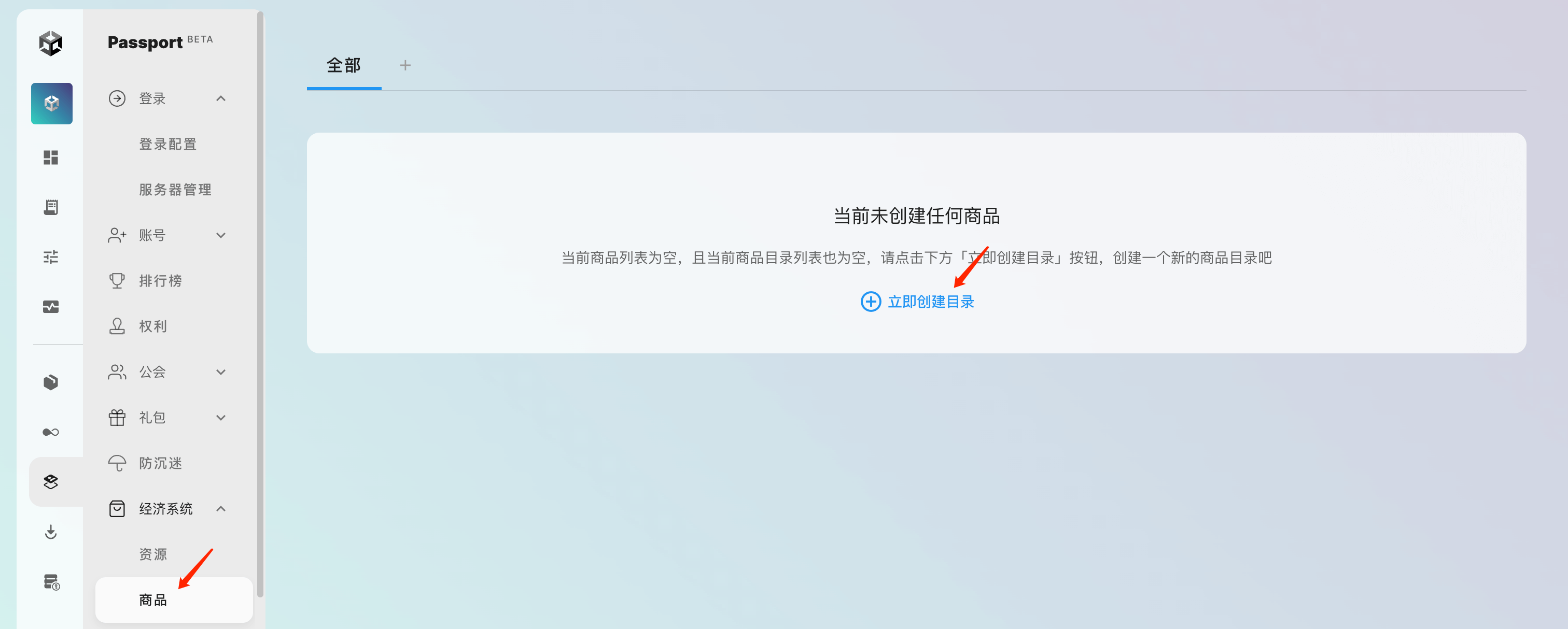 点击 UOS Passport 服务 「经济系统 -> 商品」 进入商品页面,此时商品以及商品目录均为空,首先需要创建一个商品目录, 点击「立即创建目录」: