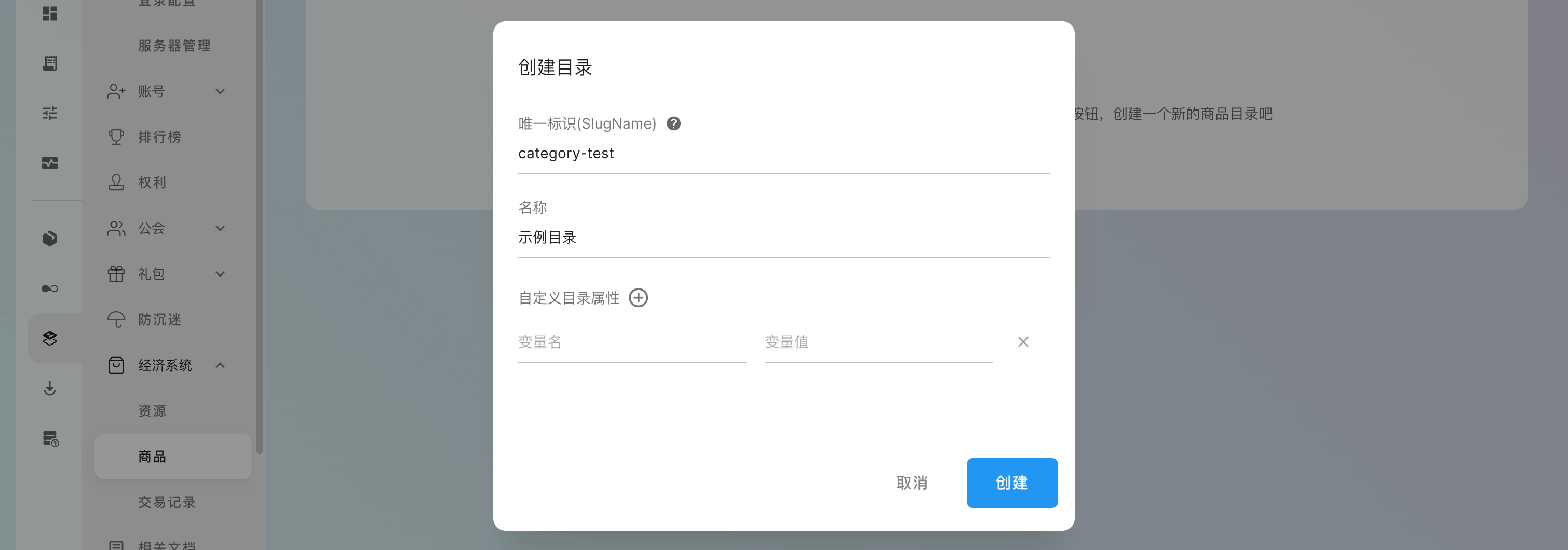 输入目录的唯一标识和目录名称,点击「创建」即可,自定义属性可根据实际需求添加: