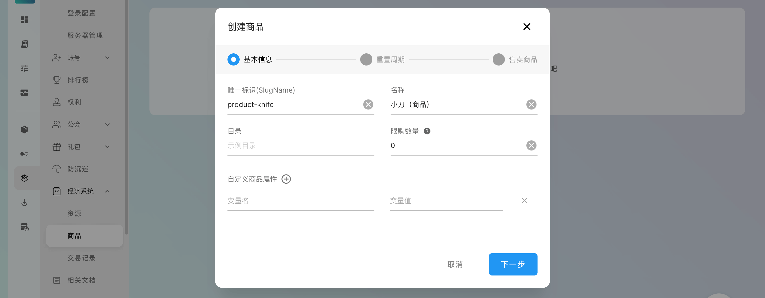 首先,输入商品的唯一标识和名称(以 小刀(商品) 为例),点击「下一步」: