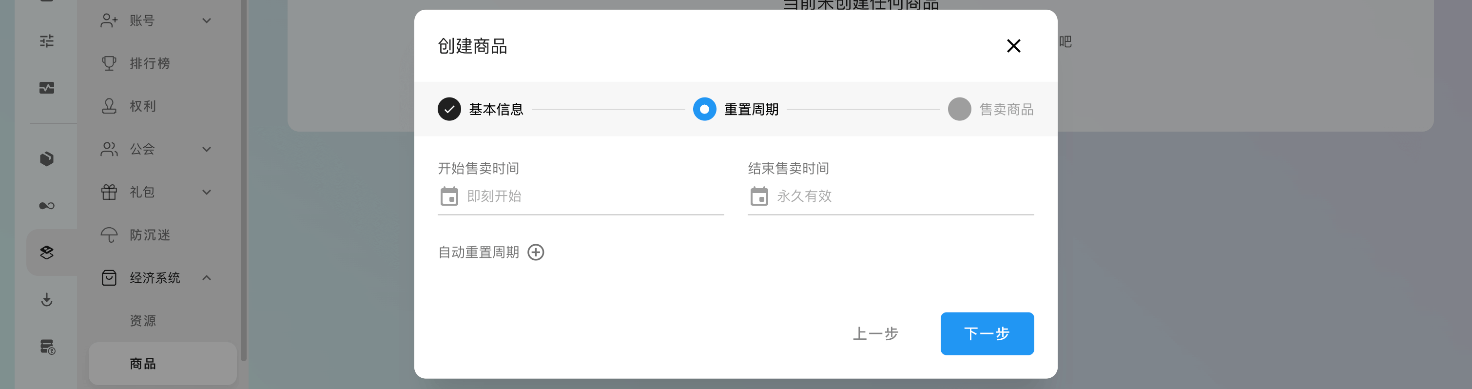 商品默认售卖时间从当前开始并一直有效,默认不开启商品重置周期,二者均可自行更改。