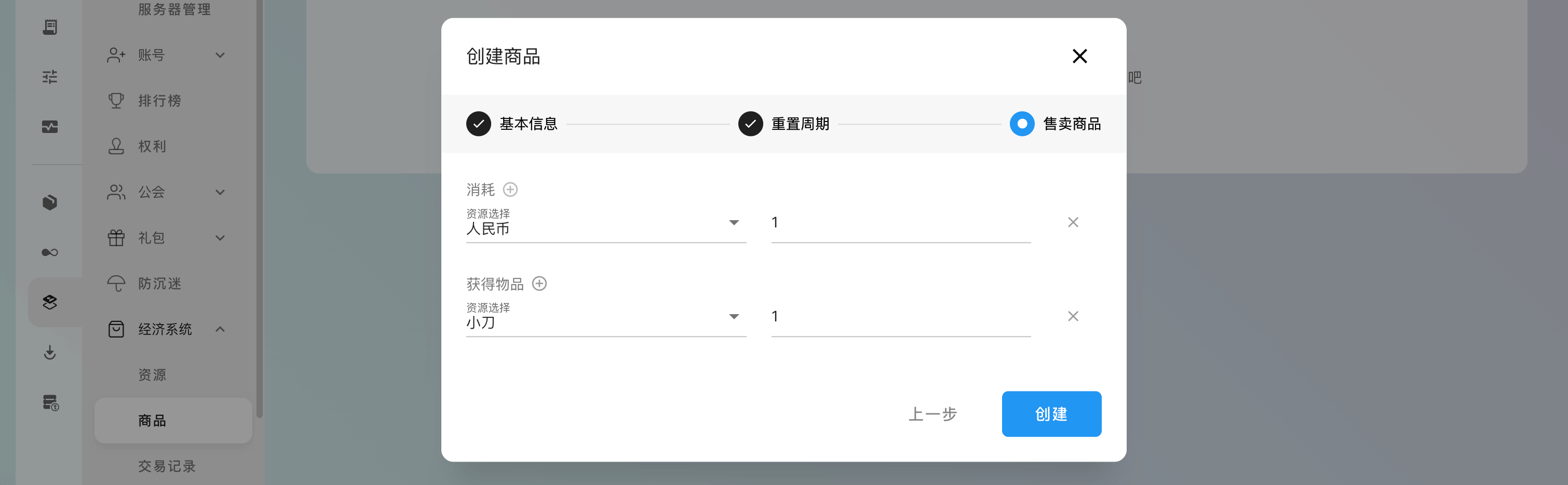 最后设置购买商品需要消耗的资源(或货币)及数量和可以获取到的资源及数量(注意:人民币不可与其它资源同时消耗。):