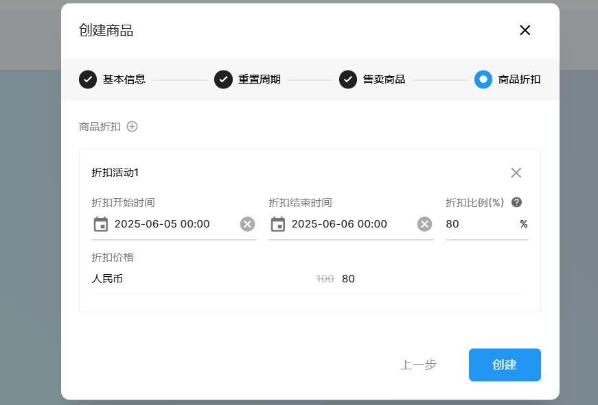 对于商品,我们可以在创建或者编辑时配置商品的折扣活动信息。处于折扣时间内的商品购买时会按照折扣后价格进行交易。