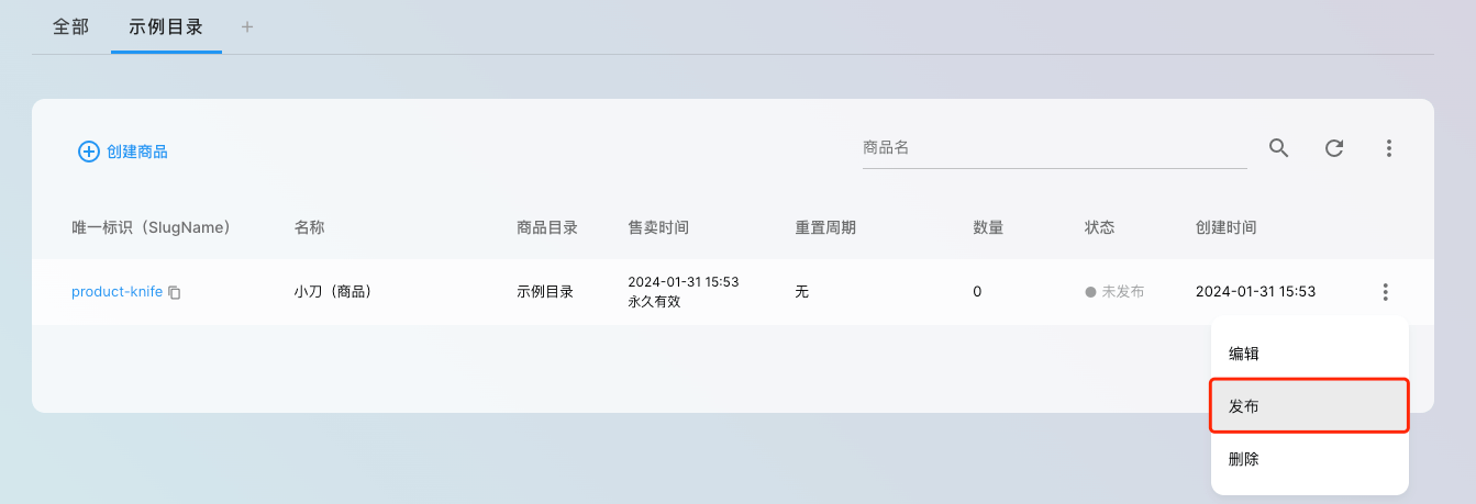 至此,我们创建一个归属于“示例目录”的“示例商品”,购买它需要消耗 人民币*1分,并可以获取物品 小刀*1,此时点击 「发布」 将商品“上架”,发布状态的商品才可以售卖: