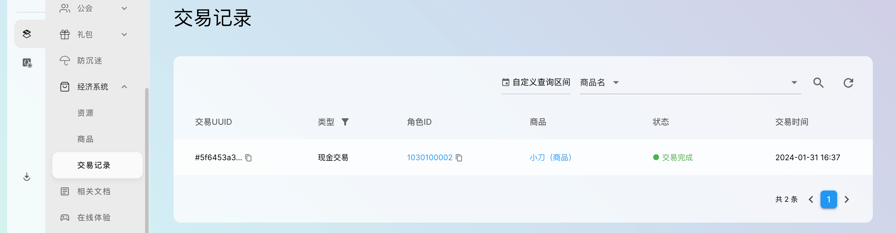 点击 UOS Passport 服务 「经济系统 -> 交易记录」 进入交易记录页面,在客户端创建交易后可看到交易记录: