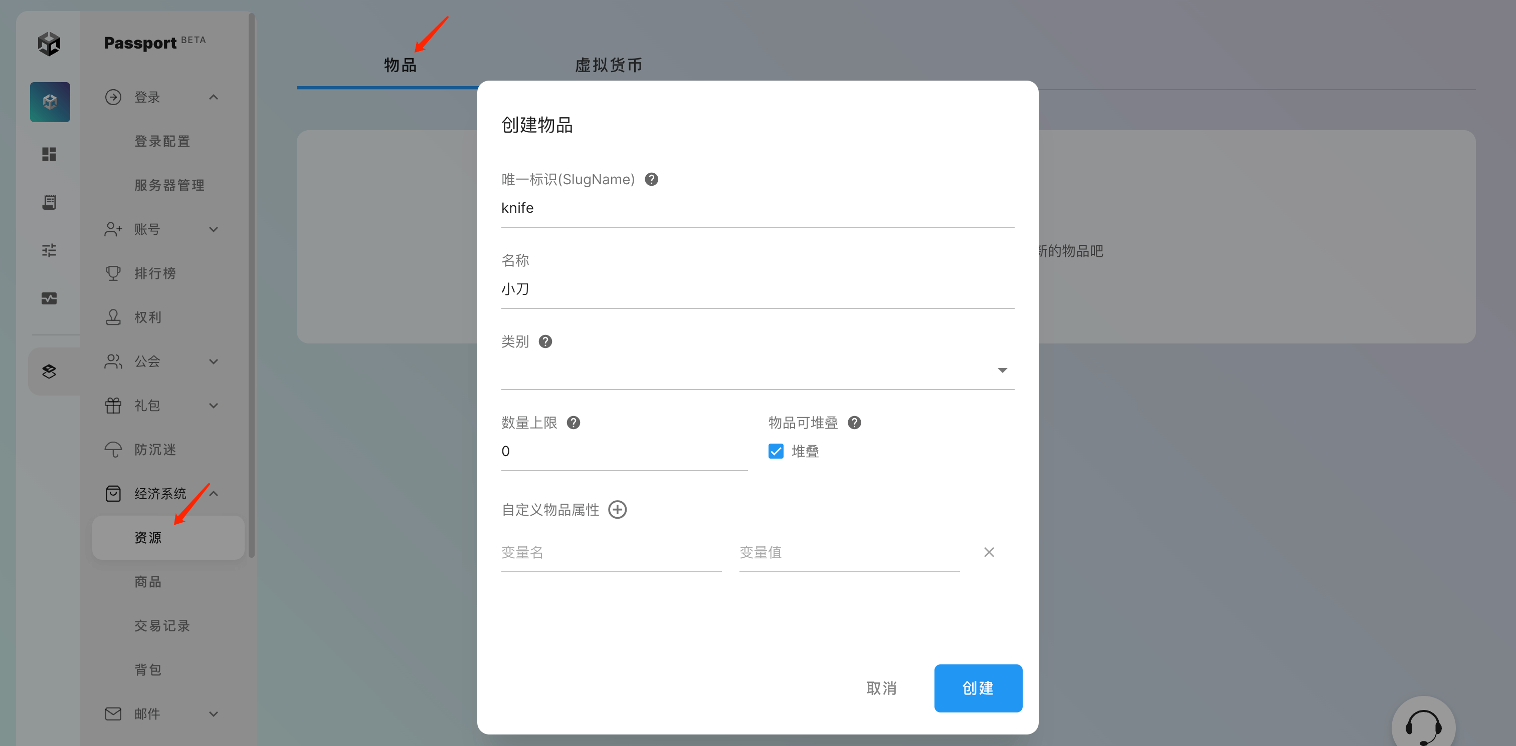 在 UOS Passport 服务 「经济系统 -> 资源 -> 物品」 处点击 「立即创建」,创建一个名为“小刀”的物品: