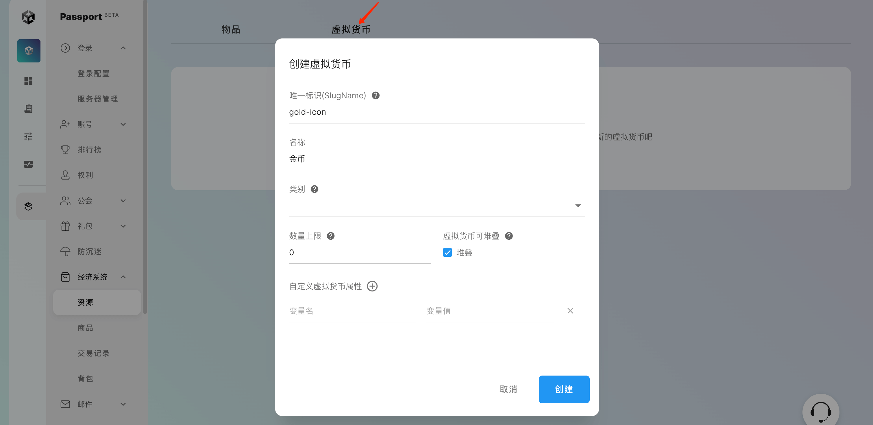 切换至 「虚拟货币」 栏并点击 「立即创建」,按照同样的方式,创建一个名为 “金币” 的虚拟货币: