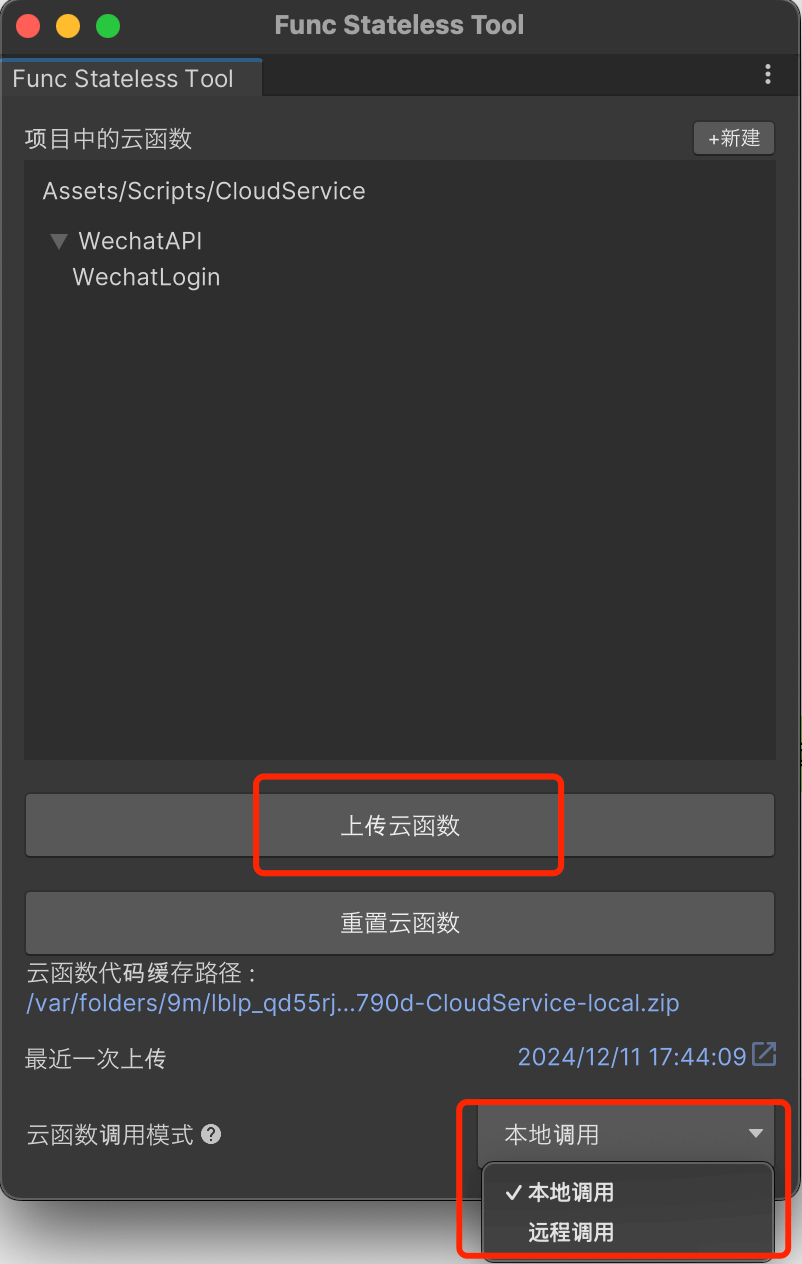 在本地编写完成云函数之后,在 「UOS -> Func Stateless -> Open Panel」 打开的 Func Stateless 开发工具中点击上传云函数,上传完成后切换成远程调用模式,完成云函数的部署。