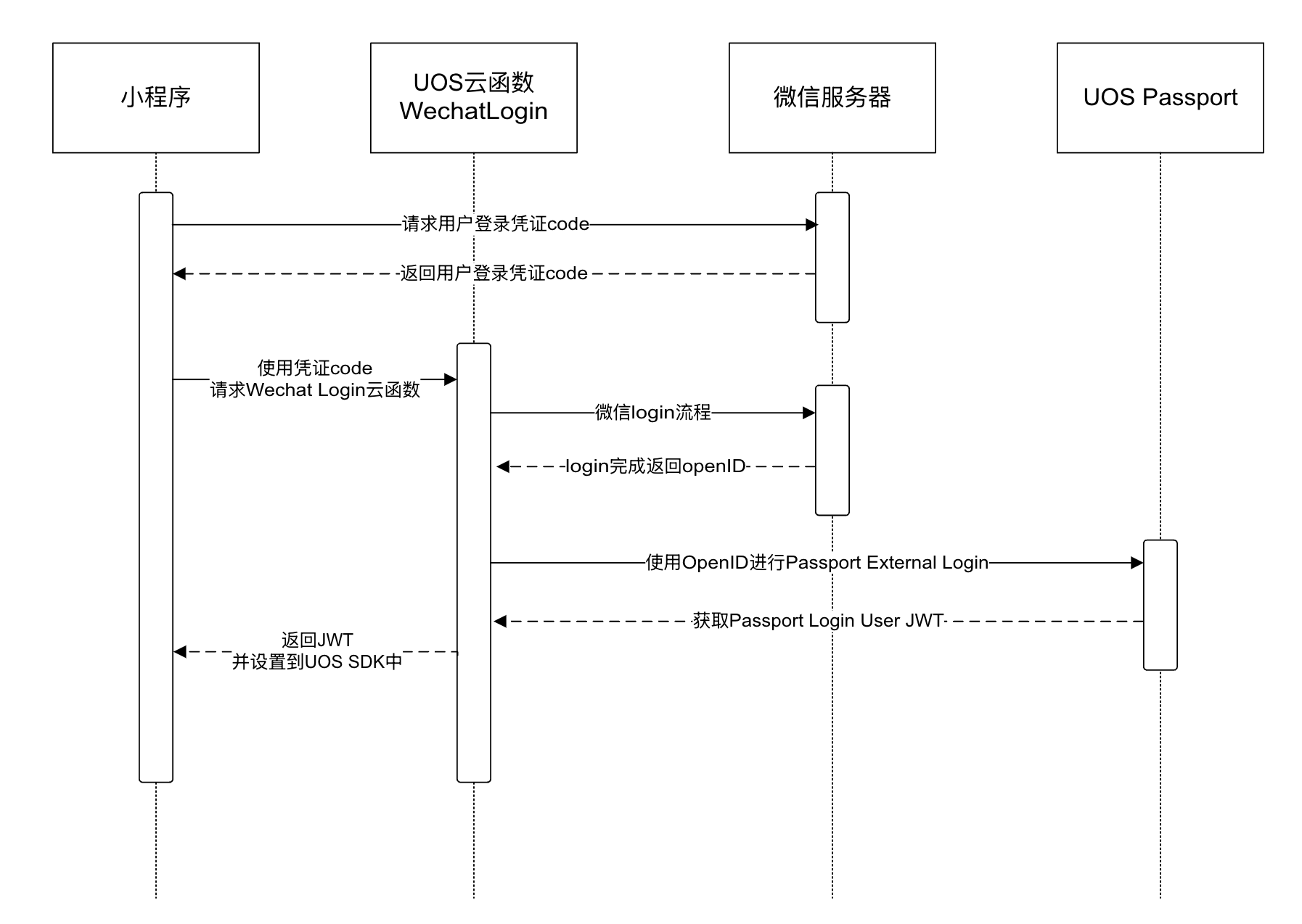 我们提供Func Stateless云函数根据客户端玩家的登录凭证code获取微信小游戏提供的openID,作为UOS Passport外部账号系统的唯一ID,使用external login登录获取玩家token,供客户端使用。