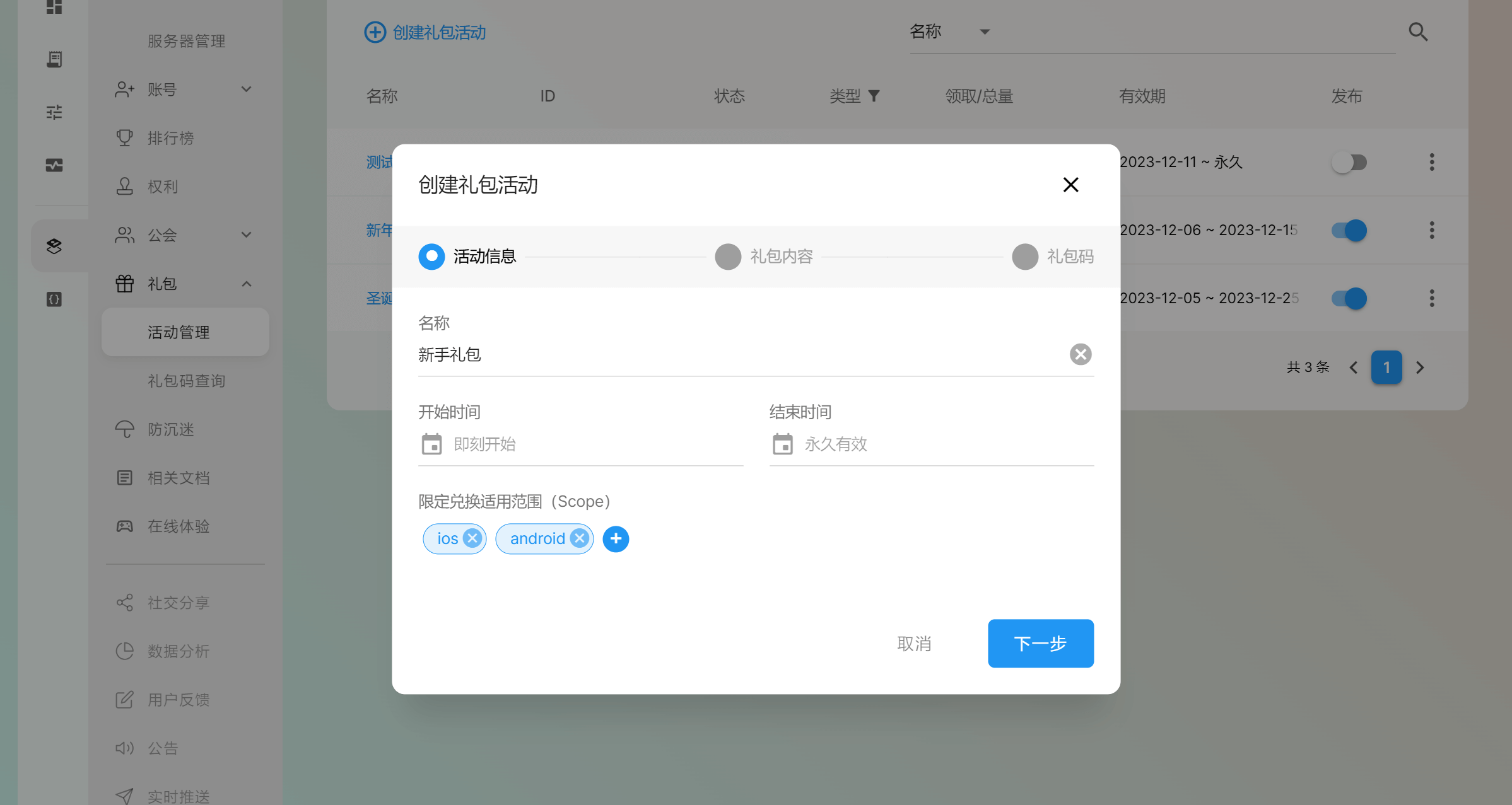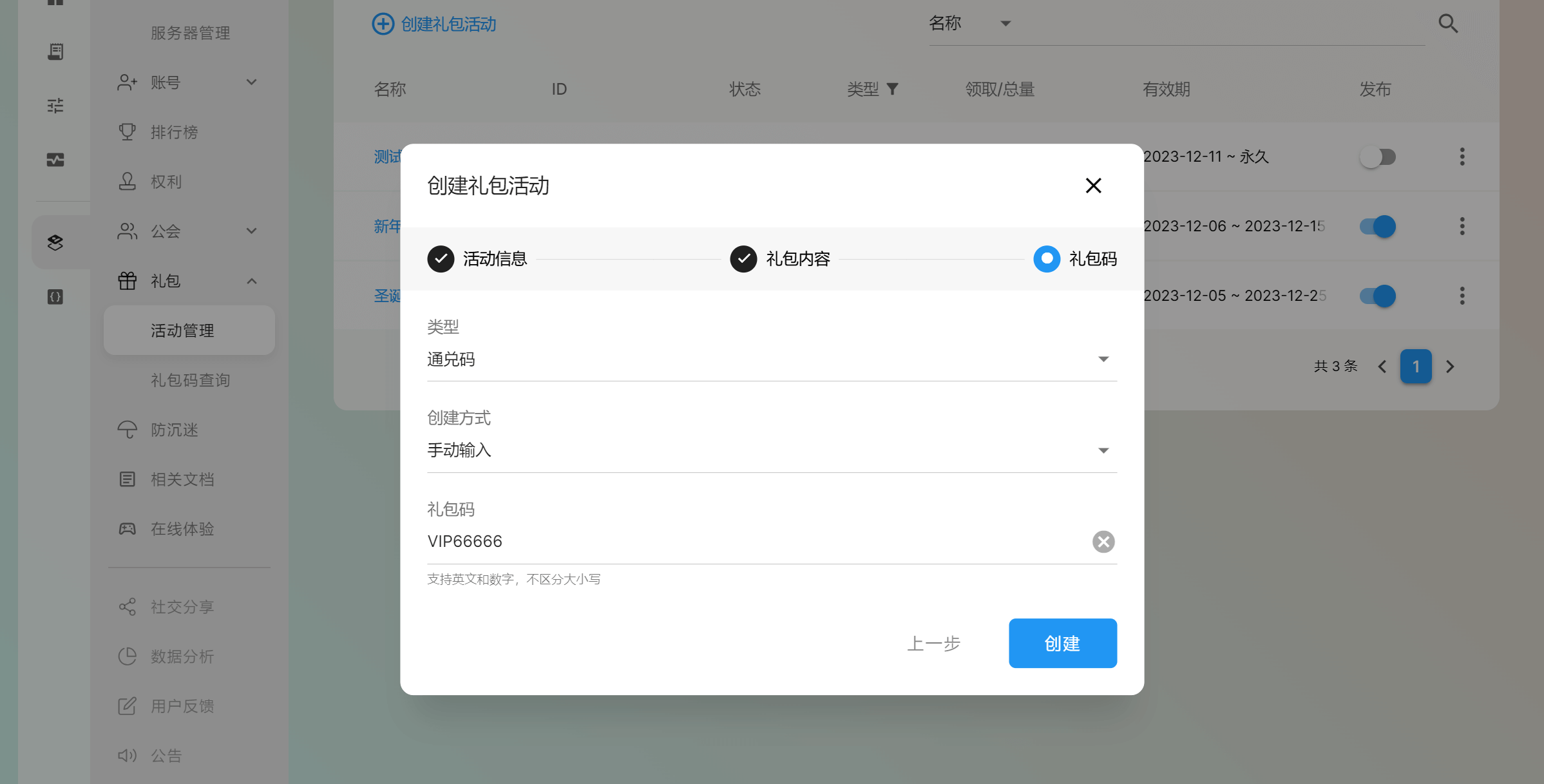 点击左上角 「创建礼包活动」 按钮进行礼包创建。