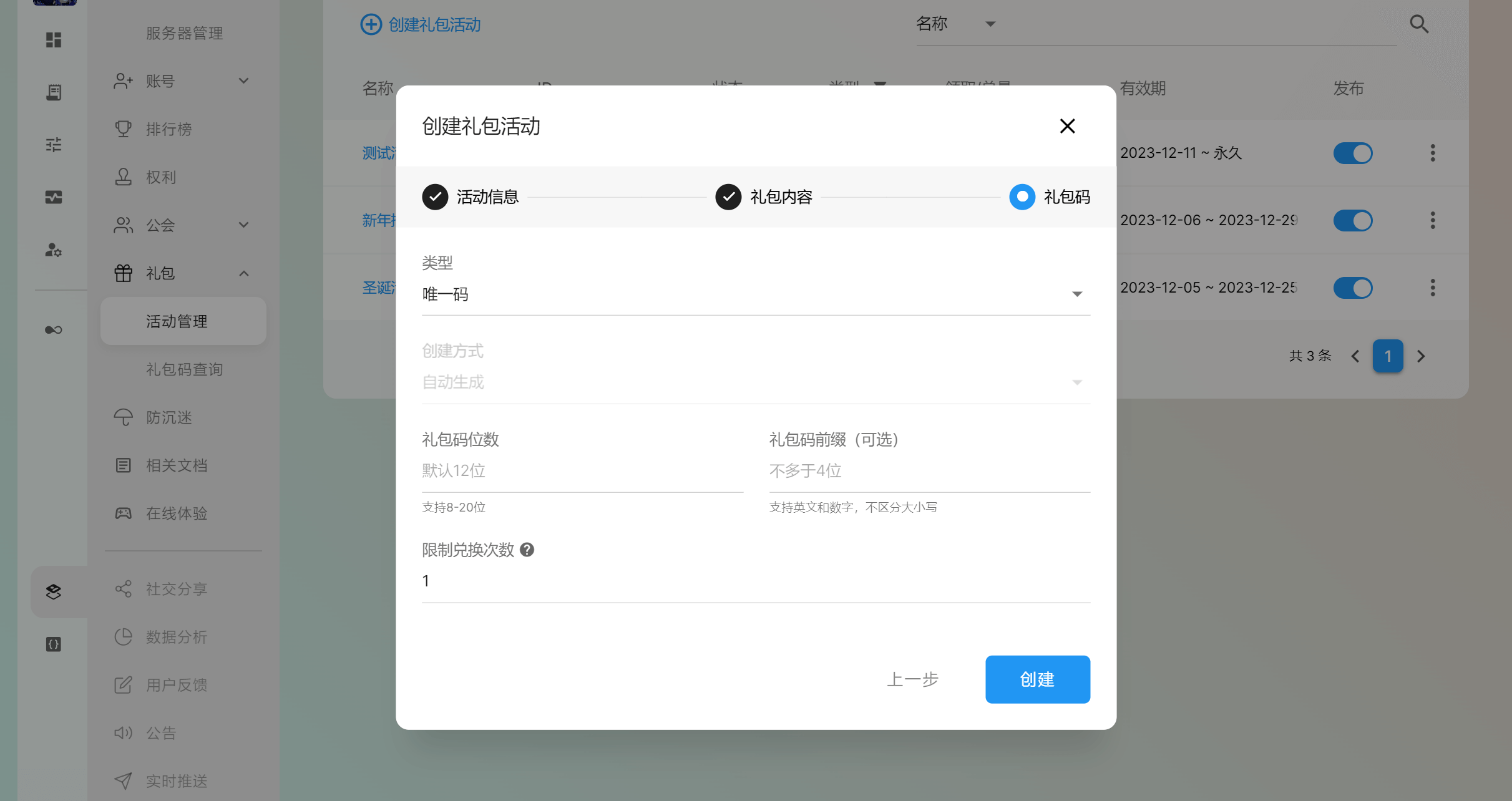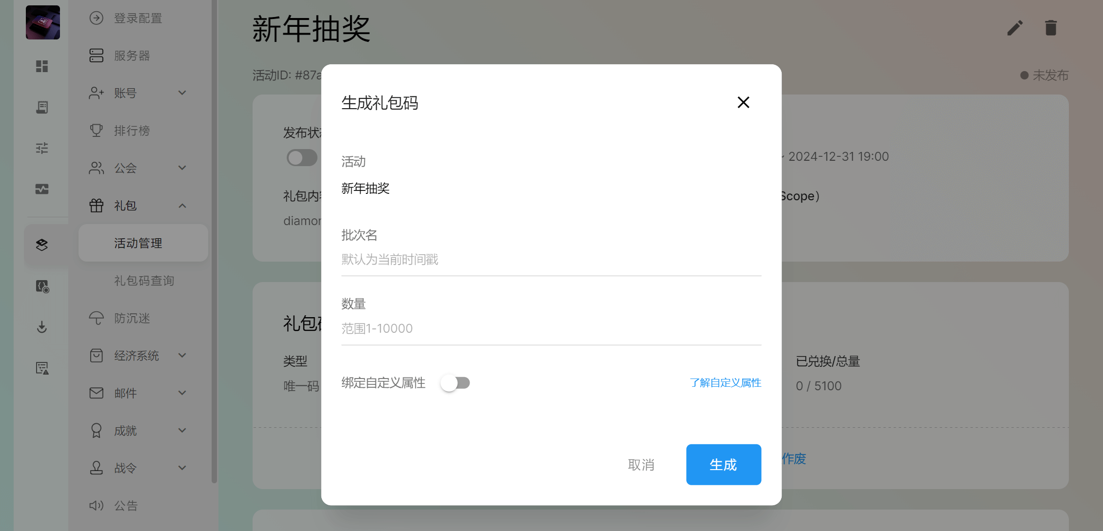- 前缀:定制唯一码的固定前缀,需满足(礼包码长度 - 前缀长度 ≥ 8)
