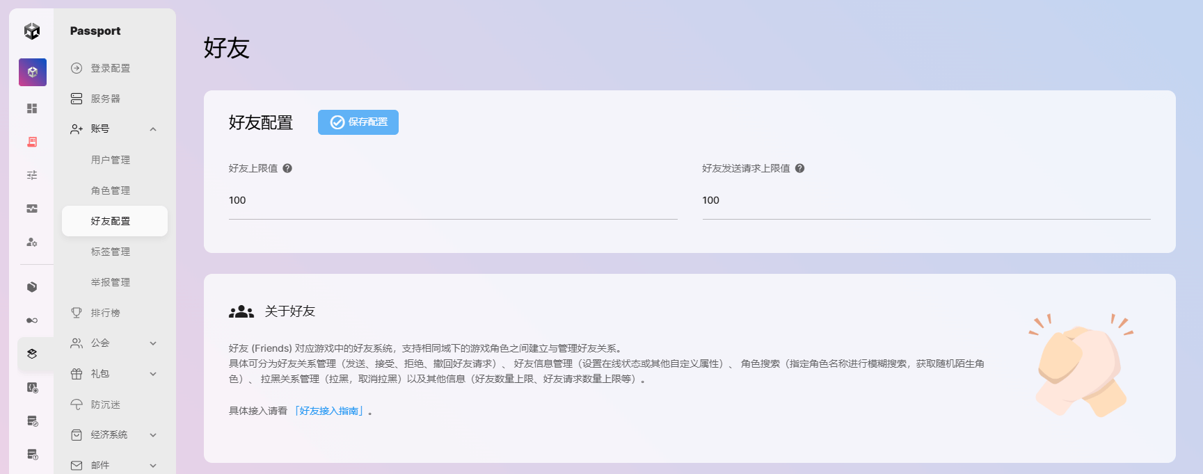 在 UOS Passport 服务「账号 -> 好友配置」配置好友上限值和好友请求上限值。
