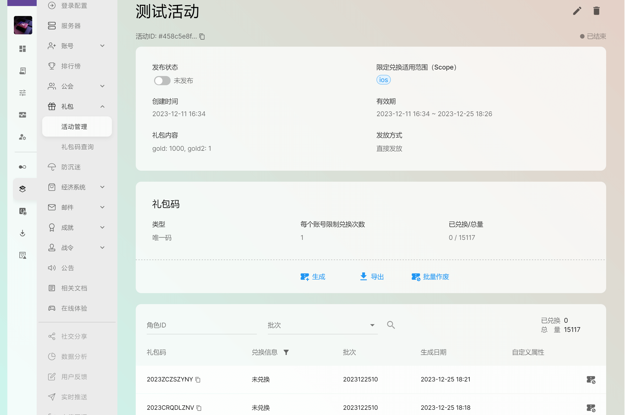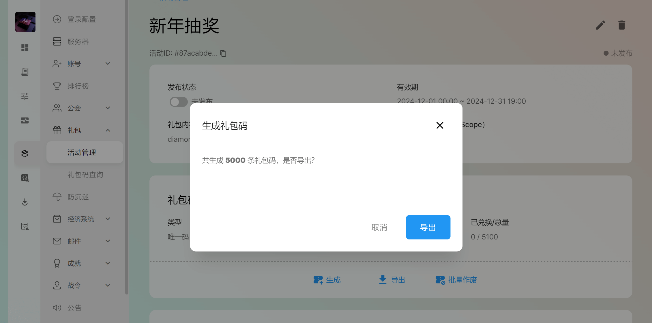 - 生成礼包码时,可以设定批次(便于统一管理)和数量,生成后,可以将礼包码导出至本地