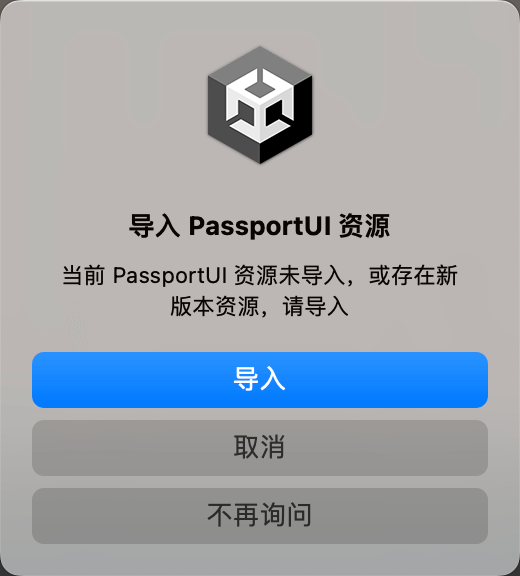安装过程中,编辑器提示 「导入 PassportUI 资源」,点击导入。