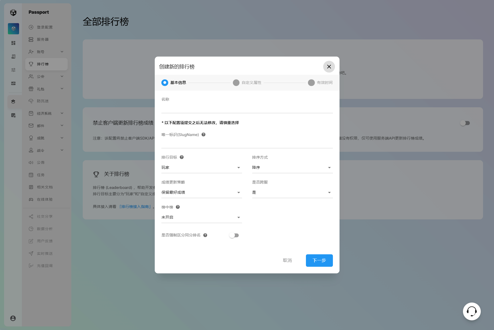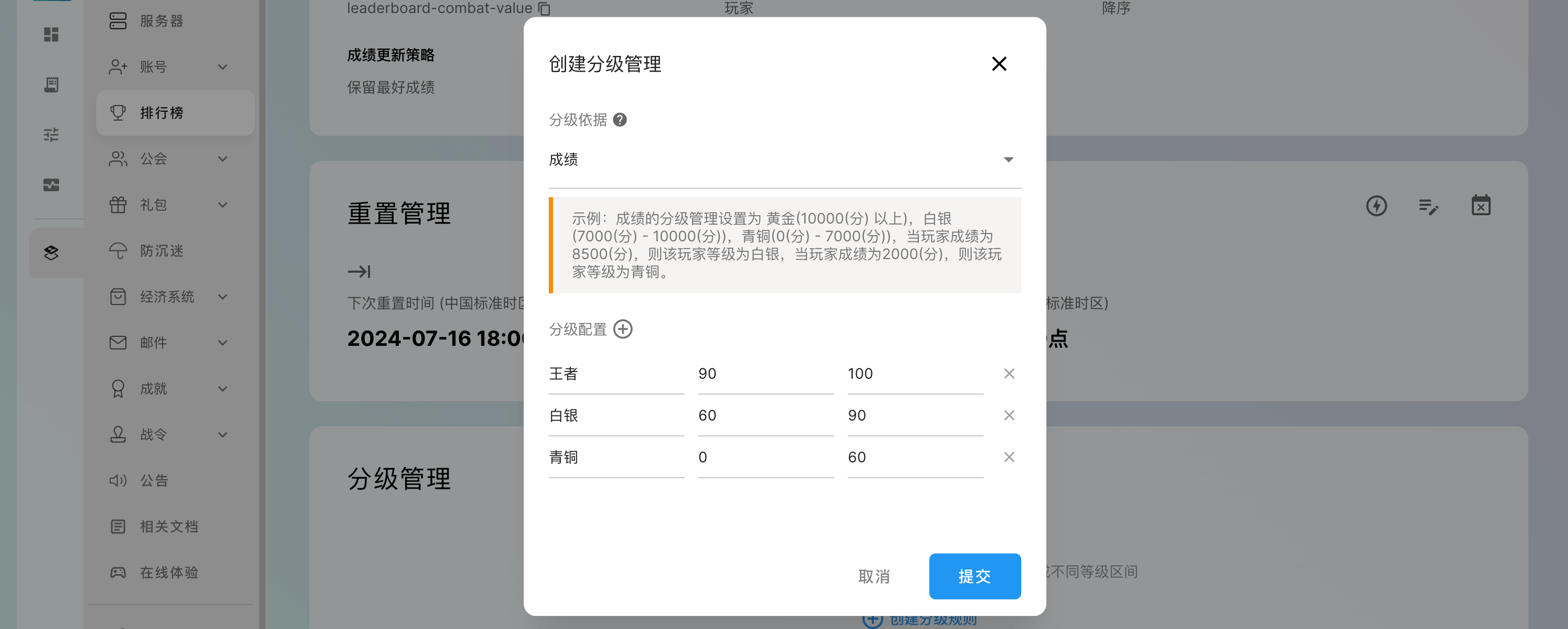 分级管理:用于计算每个成绩归属的等级,可用于分配段位、称号等。 创建分级后,返回的成绩中可以获取到对应的等级。